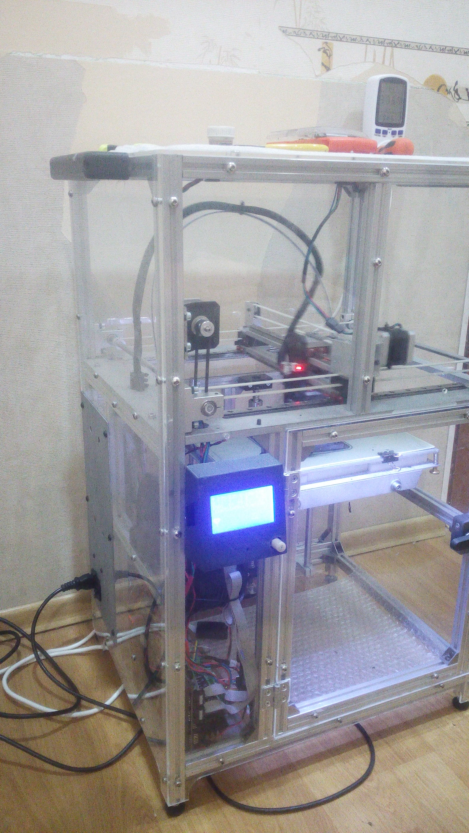 Принтер с областью 200х300х300? Собрал примерно за 20 тыс с копейками. Да, пришлось добавить оргстекло для защиты от сквозняков. Катушка пока висит за спиной. Сейчас маракую насчет полностью закрыть вместе с двумя катушками в камере. Есть задумка, осталась реализация.
