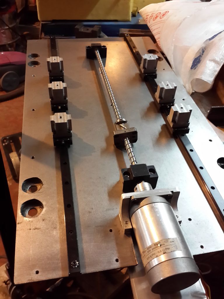 Проектик в солиде ..более менее рабочий вариант Дабы удачно прошло скрещивание ежа решился на применение жесткого каркаса из УСП12. Так же пришлось поставить быстрые ШВП класса точности С5 с шагом 10мм и "мощные" рельсы 20мм- это даст возможность фрезеровки \ гравировке по легким металлам и пластику с необходимой точностью, а не большее утяжеление оси X \ Y не повлияет на скоростные характеристики . Крепление рельсов в тело УСП сделал из обрезков штатных винтов, сделал резьбу внутреннюю М5 и пропилил шлицы на НГФ Для уменьшения перекосов оси Y попробовал применить широкое крепление Стол оси Y пришлось поднять на бонки , но сразу на 6 каретках По дороге ваяния станка освоил пару нужных технологий: