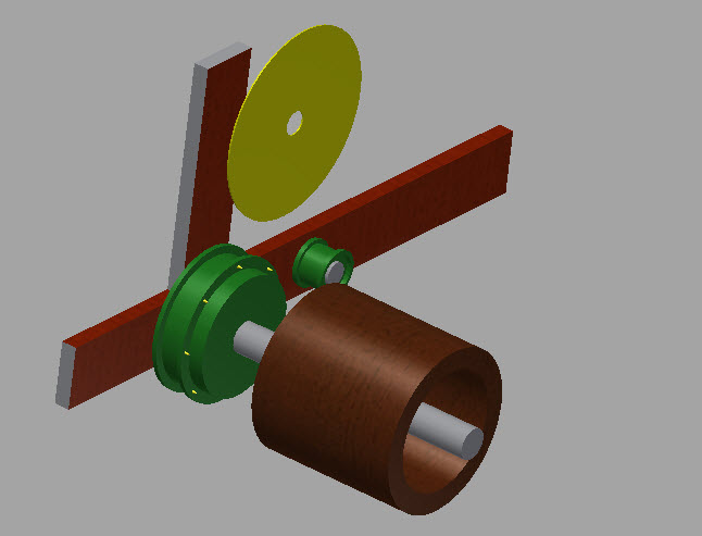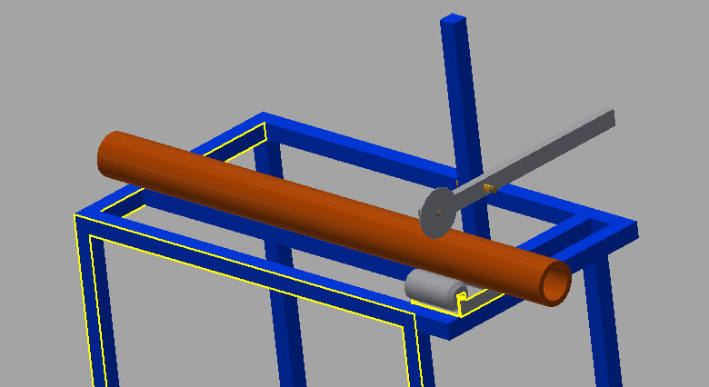 1-го января стал осваивать Inventor, поэтому извиняюсь за качество, рисую как могу, много необходимых элементов пока нет на схеме. Внутри гильзы (заготовки золотистого цвета) находится капролоновый ролик сходный внутреннему диаметру заготовки, который не даёт рвать картон когда стенка трубы прорезается дисковым ножом на рычаге. Усилие непосредственно на ноже, которое требуется для резки составляет от 25 до 35 кг. (тактильно пальцем замерял, сначала прорезал трубу нажав на место рычага где расположена точки оси на которой крутится нож, потом на весах давил до появления примерно одинаковой боли), то есть если необходимое усилие будет составлять 50 кг., его хватит с запасом.