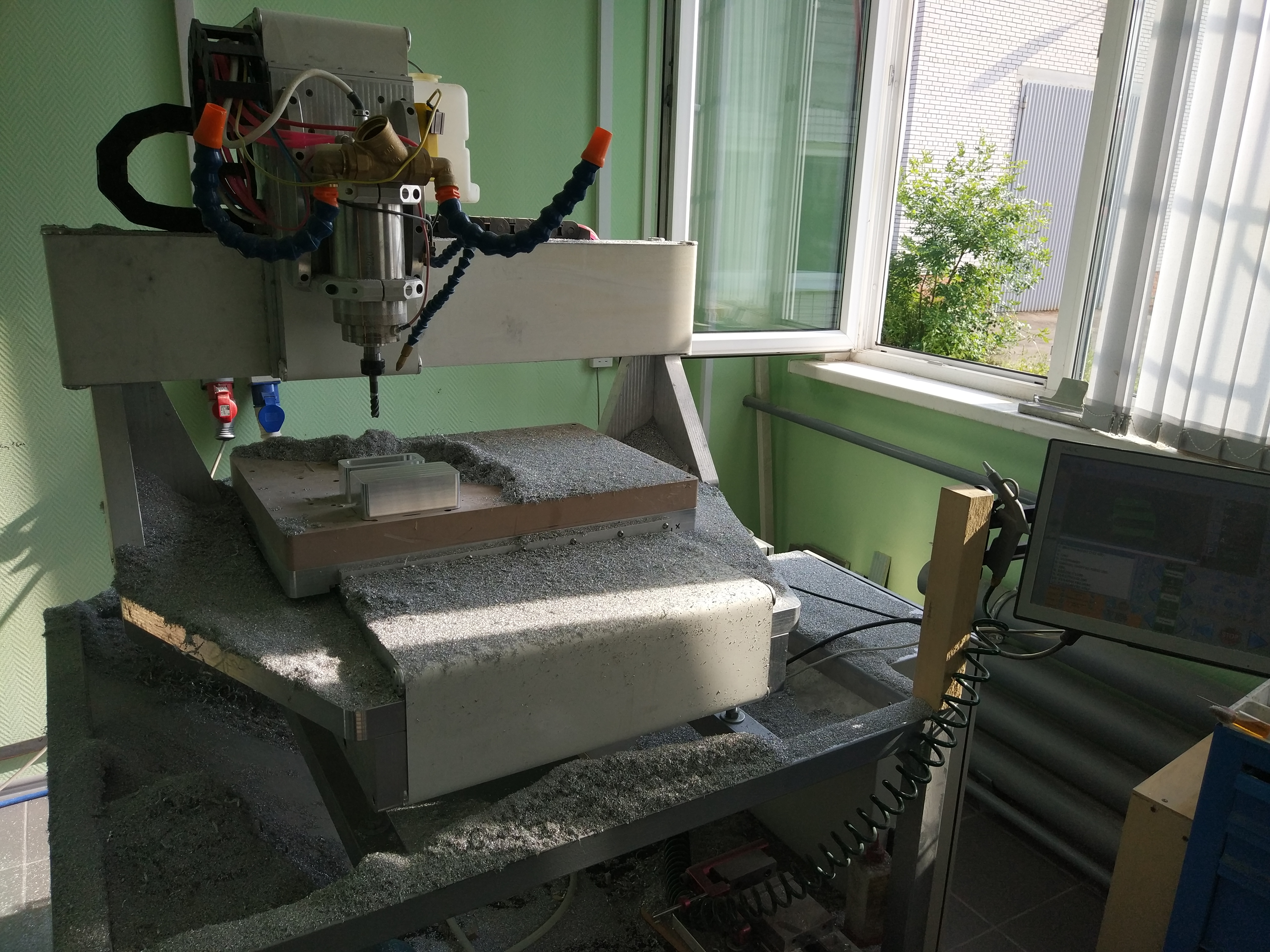 У станочка оси Х и Y на цилиндрических рельсах, ось Z цилиндрические валы. По всем осям ШВП 1605. Шпиндель водяной китаец ER16, 1.5KW, 24000 об.