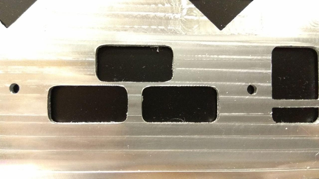 Как видно, вместо прямоугольных "окошек" получились бочкообразные. Плюс, углы не "совпадают". Поясню. Стратегия обработки этих окошек такая: выборка контура 6 мм фрезой с заглублением по 0.5 мм, затем проход контура на всю глубину фрезой 4 мм, и для некоторых окошек так же дополнительно фрезами 2 мм и 1 мм. В результате, видно очень явно, углы получаются смещёнными, что ли. Причём, такое с углами и при применении Rest Machininig (когда обрабатывается только то, что осталось после фрезы 6 мм), и без него (когда идёт проход по полному контуру).