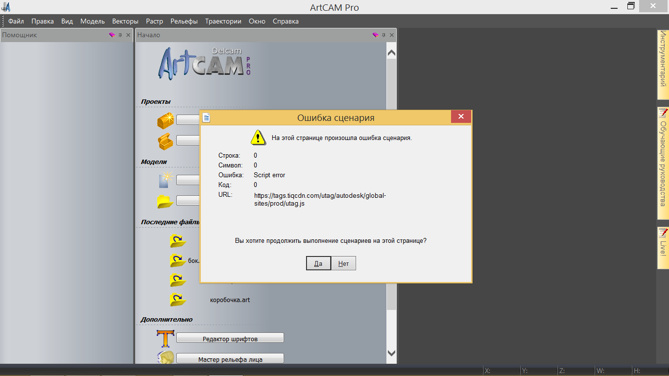 Обнаружил как то запуске АртКама 2011 всплывает ошибка. Попробовал запустить без подключения к инету,