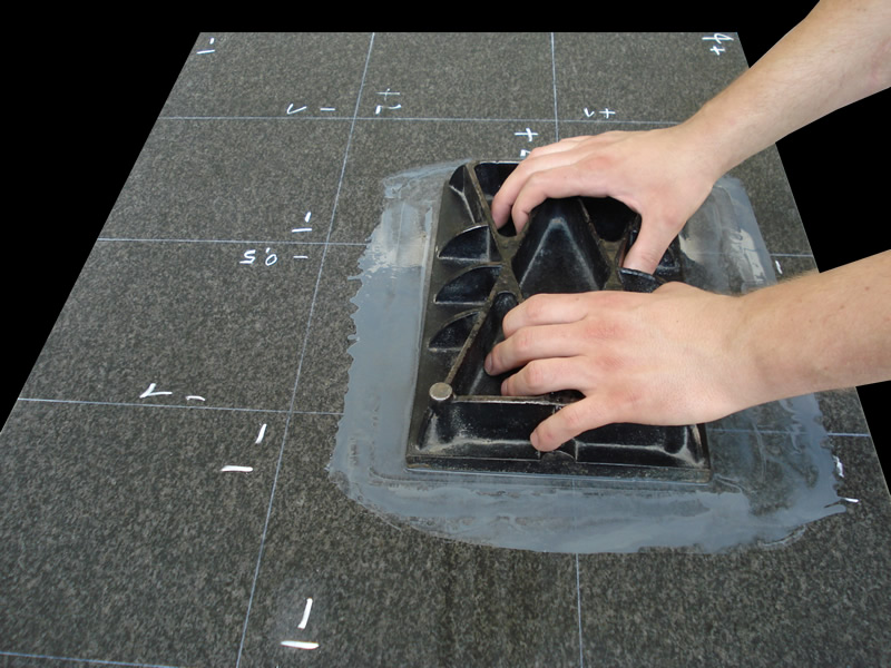 Примерно,как на фото,так выравнивал поверхность гранитной плиты..,только сперва алмазным большим диском ф250мм тип 6А2 на мет.связке с крупным зерном 160/125,далее с порошком мелким и маленькой поверочной плитой.Ну и по ШМ смотрел,где перепады.
