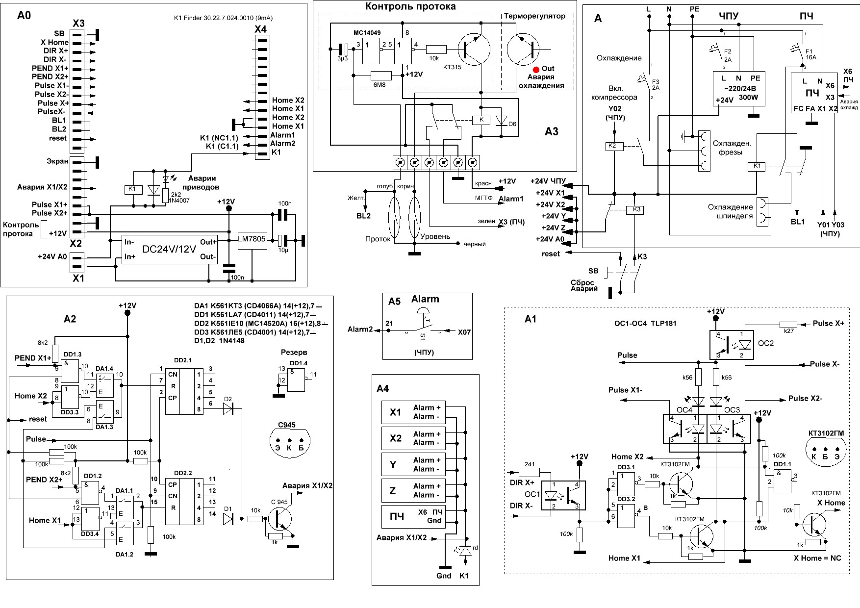 Разработанная плата не привязана к конкретному контроллеру. Ей все равно с кем работать. Блок А1 можно использовать отдельно - схема приведена ранее. Для нормального контроля перемещения нужны блоки А1 и А2. Задача этой связки не только правильная установка в домашнюю позицию двух двигателей на одной оси, но и контроль их работы. У меня был случай когда на одном драйвере были проблемы с питанием, а второй работал и перекашивал каретку, не выдавая Аварию по перегрузке. Для исключения этого и был сделан А2. Драйвер для моей схемы скорее всего так же можно использовать H86S, но у меня его нет и за его схему я не ручаюсь (в смысле соответствия переделки на JSD2505M.) Драйвер так же может быть и без обратной связи по энкодеру, но энкодер или датчик импульсов нужен обязательно. Сигналы Alarm у JSD2505M и H86S формируются при: токовой перегрузке и проблемах энкодера. Схема блока А4 объединяет все Alarm с драйверов где они есть JSD2505M/ПЧ/платы и через реле К1 (в А0) выводит их в цепь Аварийного отключения (E-Stop), если в нее перенести реле К1, то остальные блоки для ее работы не нужны. Блок А2 можно использовать отдельно, подав необходимые сигналы.
