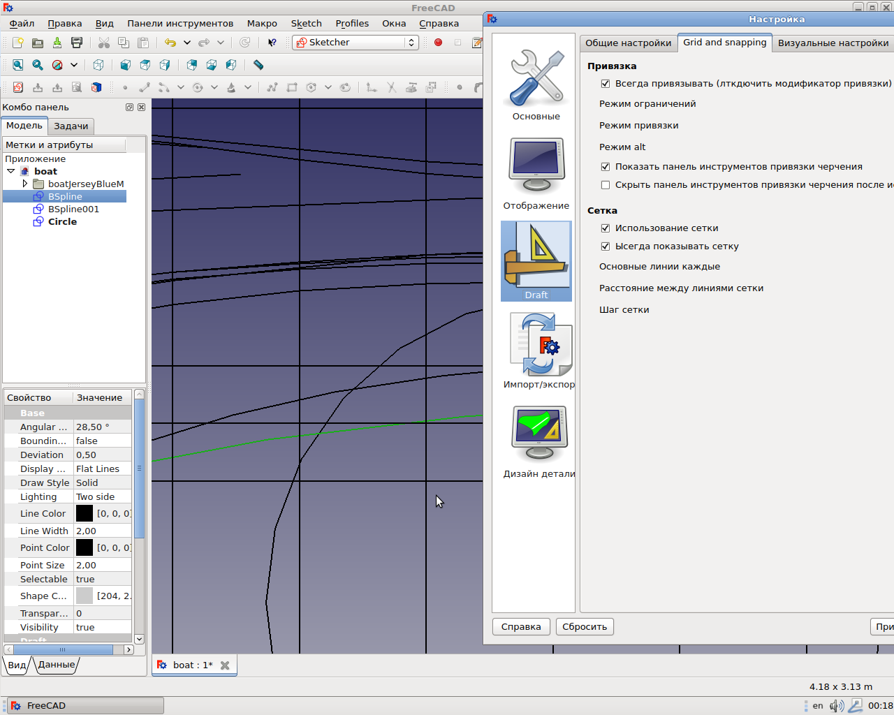 для порисовать там скорее верстак Sketcher, все отрисовывается гладенько. Сетка -Меню-Эдит-Преференц- влкдака скетчер В дебиане, как и в бубунте, можно прописать "дейли" репозиторий и получить 0.17 версию. Если Вы планируете собирать объемные модели, то подход 0.16 и 0.17 сильно отличаются. А коли Вы здесь, то, скорее всего, захотите потом получить g-код и в этой части 0.16 не выдержвает никакого сравнения с 0.17.