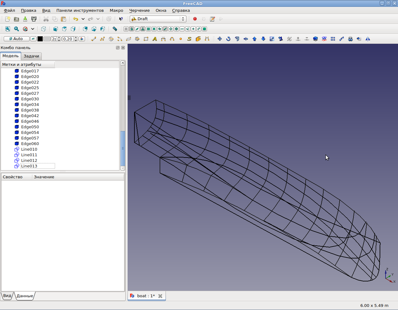 Построил модель в другой программе, ради интереса запихнул в фрикад и попытался натянуть поверхность. Не желает никак. Расстояние порядка Е-7 вроде бы должно считать совпадением. Реально несовпадение порядка Е-13 - контур незамкнут. Кроме того непонятно как разделить линии. Каждый кусочек нужно показать закрытым контуром, а как разделить линии, если не все сразу, то хоть по одной? Не нашел для этого никакого инструмента.