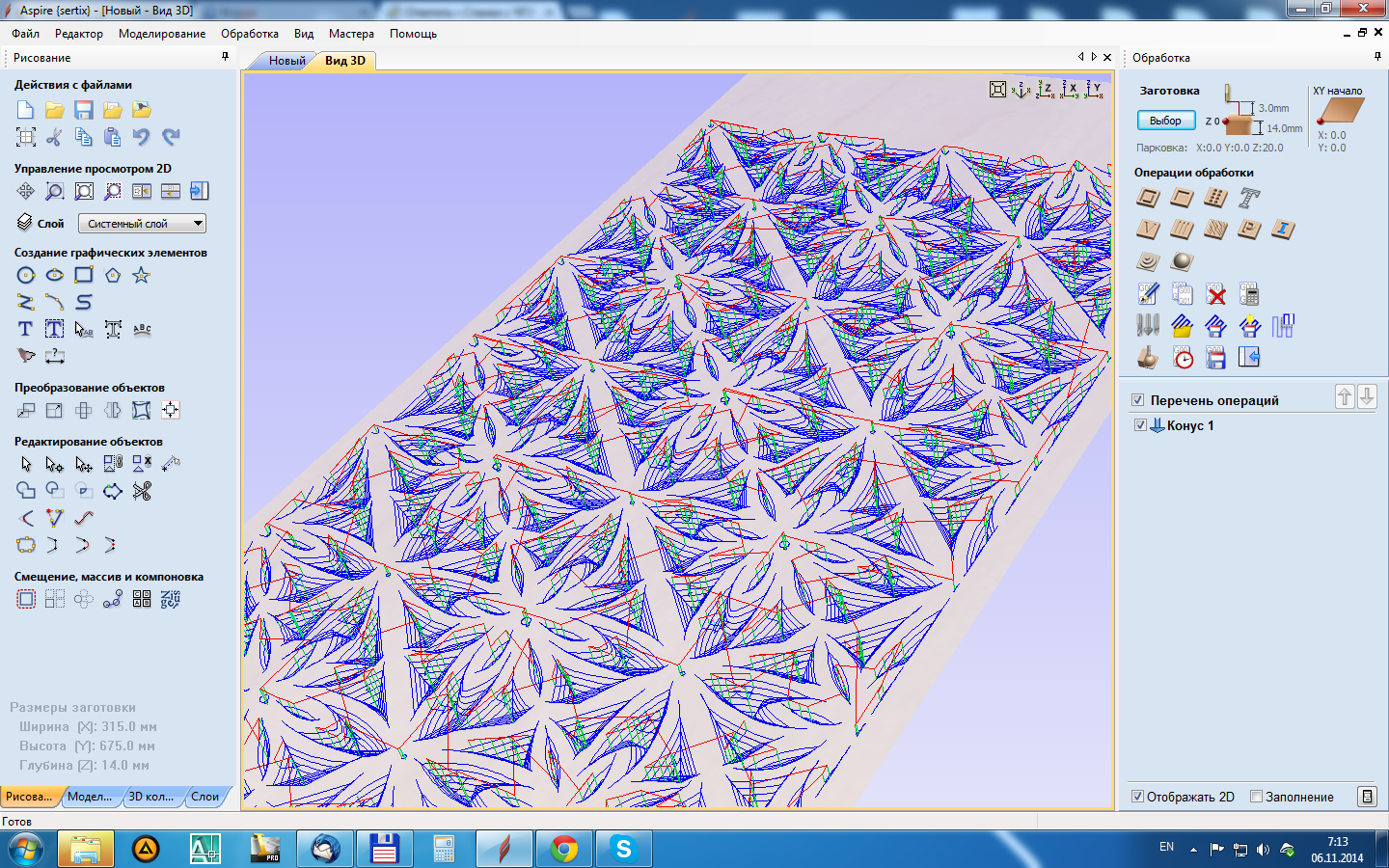 sertix писал(а):Настроить инструмент нужно в базе, глубину реза за проход сделай максимальной по размеру фрезы