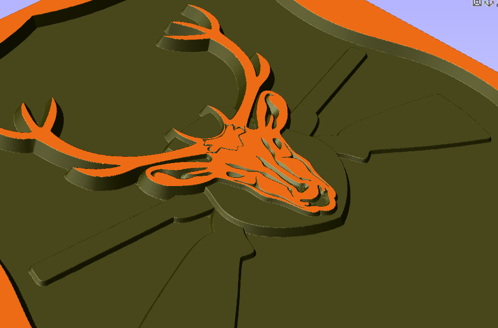 Если сверху вниз (так как то привычнее) то сперва идет выбрка вокруг головы с рогами на гл. с 0- 3мм, потом выборка вокруг медальона и выступающими за медальон рогами уже с гл. 3 до 6мм, и далее стволы с6 до 9мм, все это концевой d5 и фасонной V90 d6. При такой последовательности когда фасонная режет второй слой то снимает и с первого слоя, пытался корректировать вектора второго слоя, мозг закипел, даже хотел бросить эту затею.