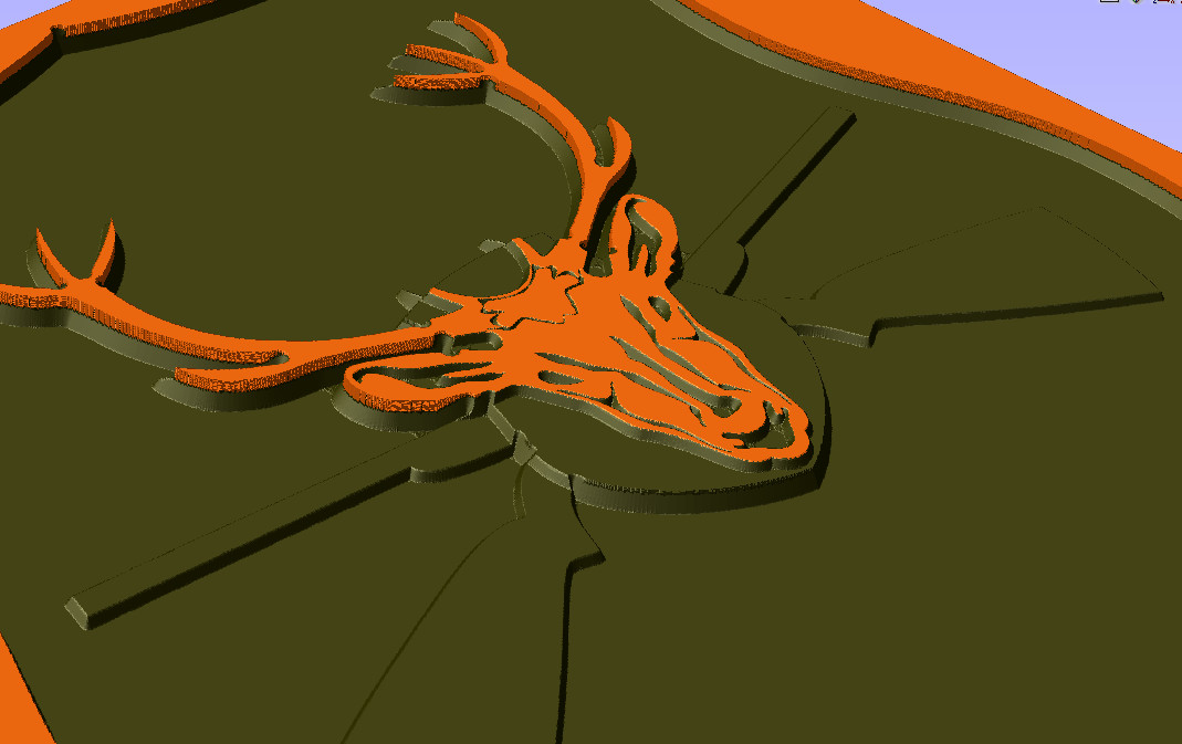 При пробах разделении векторного рисунка по слоям выяснил что почему то прога нормально режет если обрабатывать снизу вверх. Разъясну: имеется векторный рисунок, голова какого то оленя естеств. с рогами, медальон где прикрепили голову и стволы которым добыли эту голову. Если гравировать все это по средней линии получается хорошо но как то плоско. Поэтому, разделил на три слоя - на три части, голова, медальон и стволы. Все три слоя глубиной по 3мм, общая гл. 9мм.