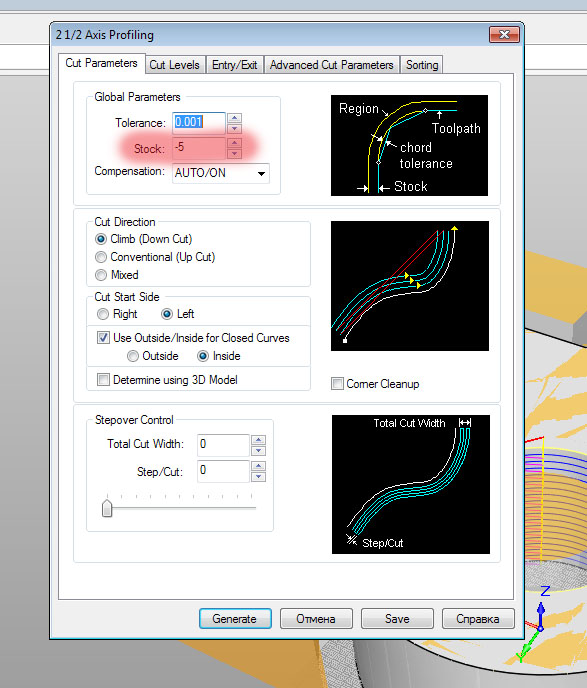 На самом деле думал может кто то конкретно подскажет как это сделать в VisualMill. Ну коли нет то рассказываю: если просто попытаться включить компенсацию инструмента то почему то при фрезеровке внутренней поверхности компенсация не включатся. А вот при обработке внешнего контура все пучком. Тогда мы просто грубо и цинично обманываем программу, и обработка внутренней поверхности как бы выворачивается на изнанку. (см картинку)