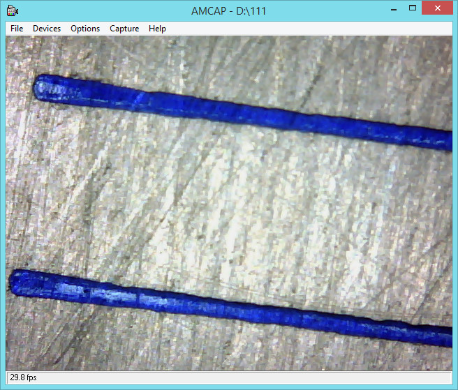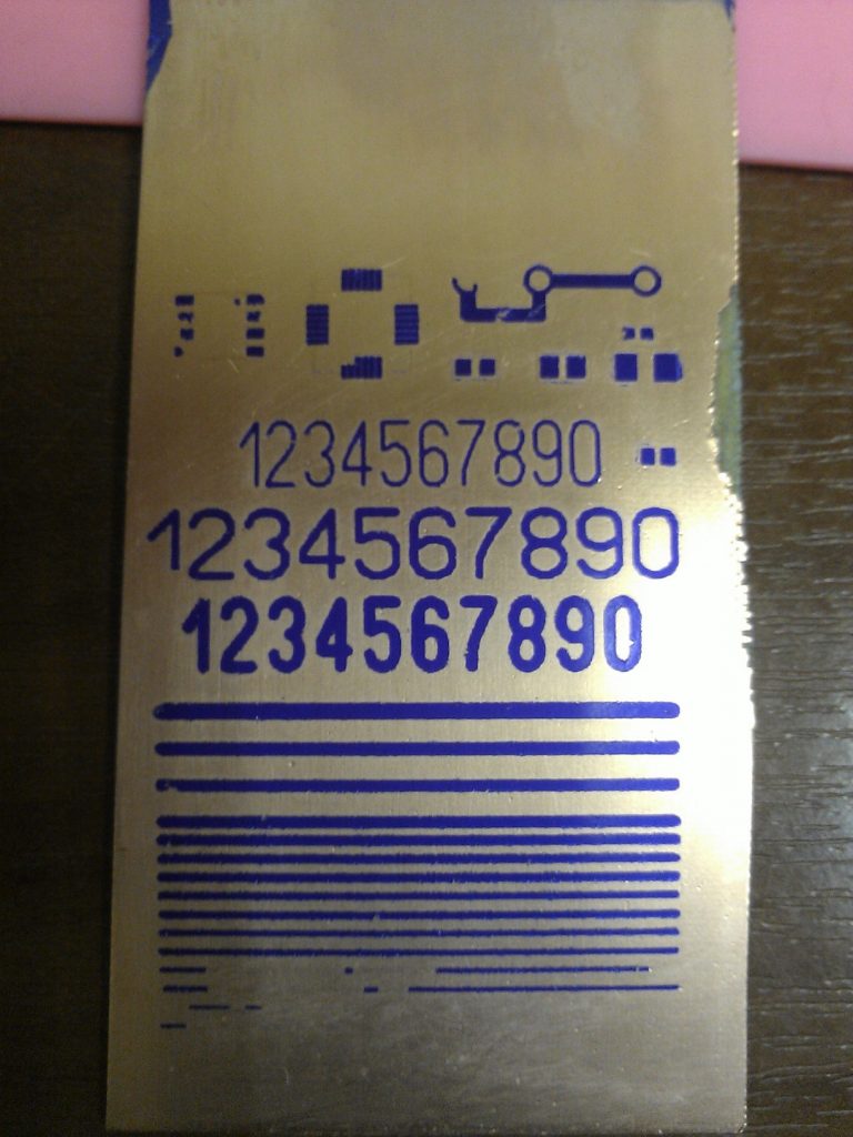 Вот как было после засветки: А вот как после полоскания в соде: Дорожки 0.1 мм вообще смылись, дорожки 0.2 мм частично, дальше толщина увеличивается с шагом 0.1 мм до 1 мм, там зафиксировалось вроде нормально.
