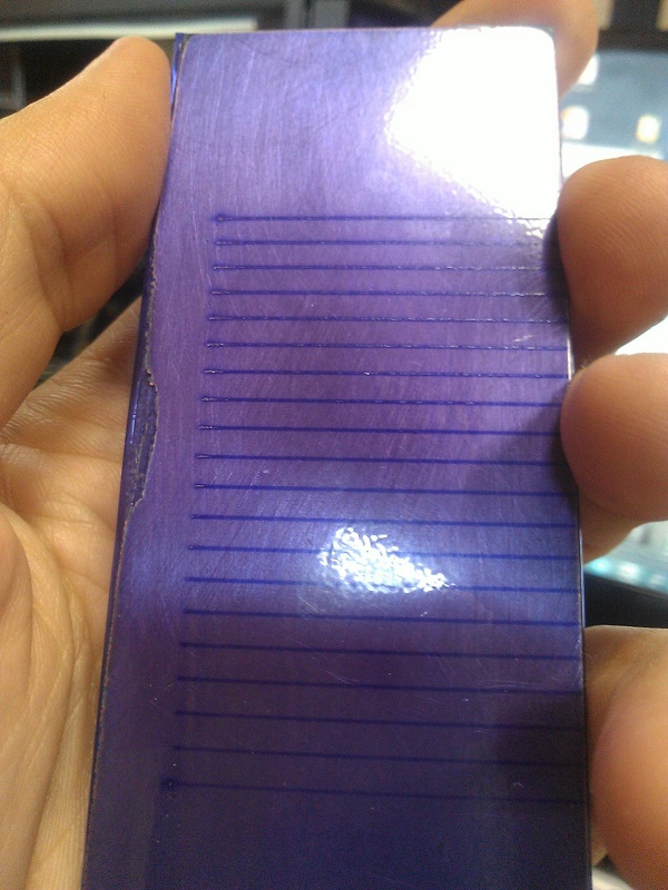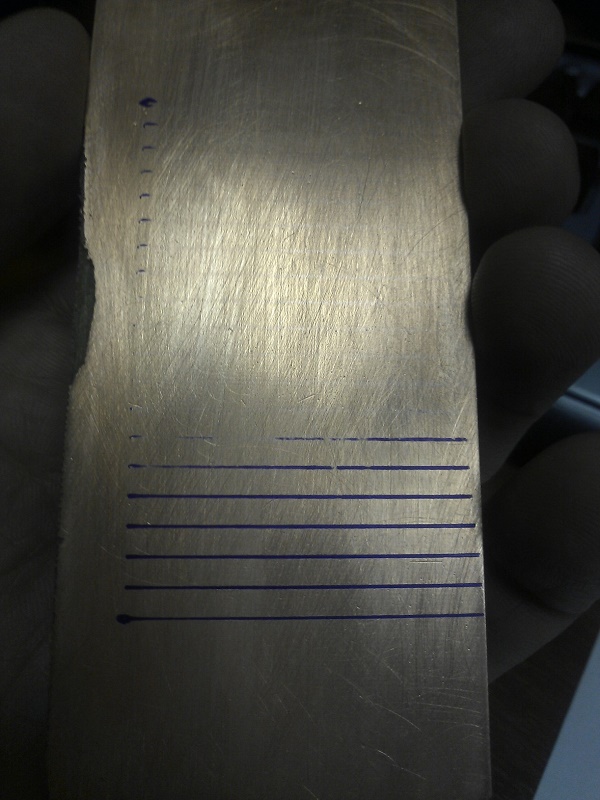У меня получается уже стабильный результат, вот примеры дорожек 0,2 мм с разной мощностью, с низу вверх от 1% до 20% мощности с шагом 1%