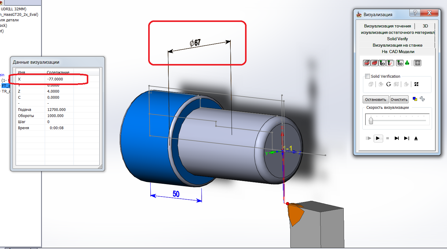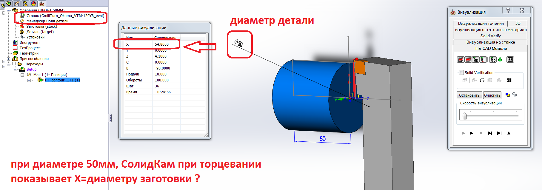 При диаметре детали 50мм, СолидКам упорно показывает что Х проезжает 50мм, хотя должен показывать 25мм