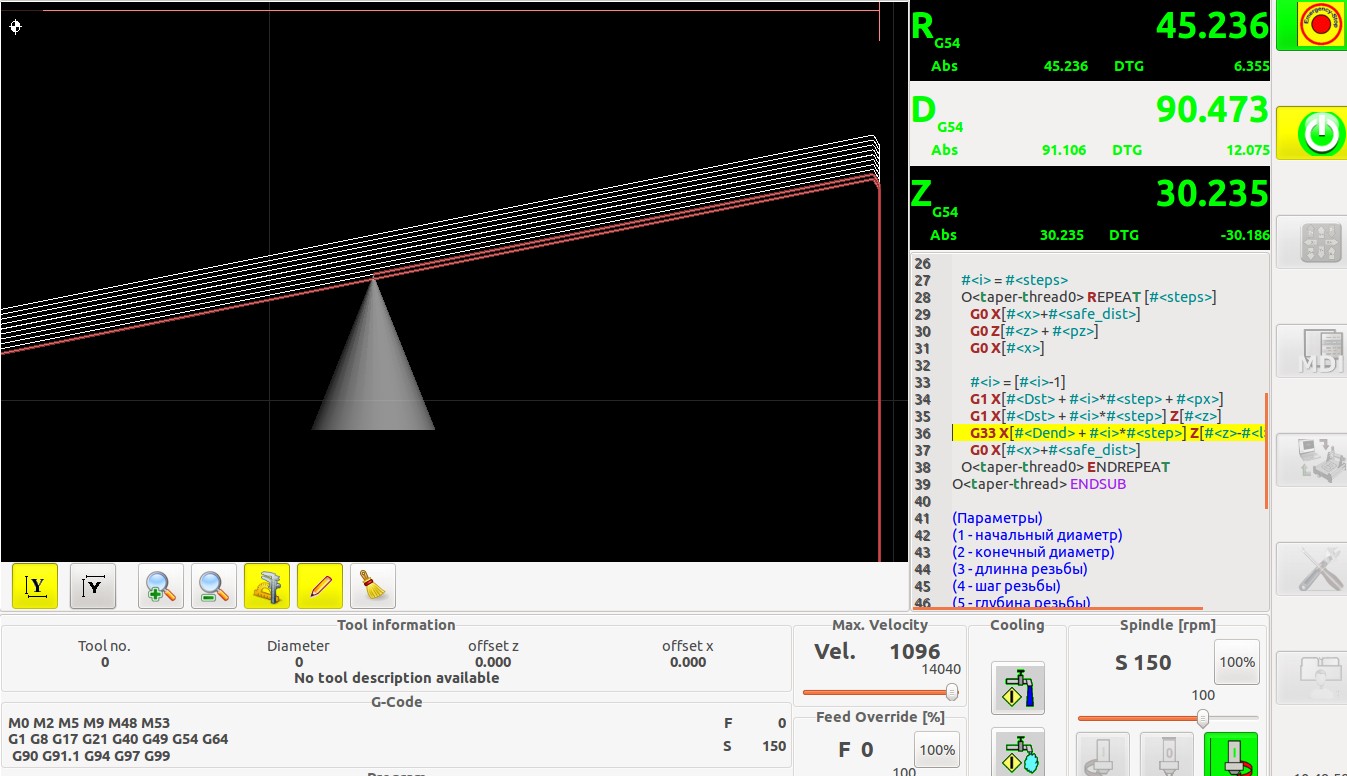Проблема нарезать коническую резьбу. Начинать нужно с нарезки конусной резьбы ЛЮБОЙ в Lcnc. Идем сюды http://linuxcnc.org/docs/2.6/html/gcode ... ing-Canned и видим что у Lcnc в цикле G76 нарезания резьбы. нет такого параметра как угол резьбы. Как резать резьбу будешь? Сделать это можно через G33 http://linuxcnc.org/docs/2.6/html/gcode ... indle-Sync Код писал Nick [WIKI] Конусная резьба G-код #1 Но код малость не рабочий :freak: