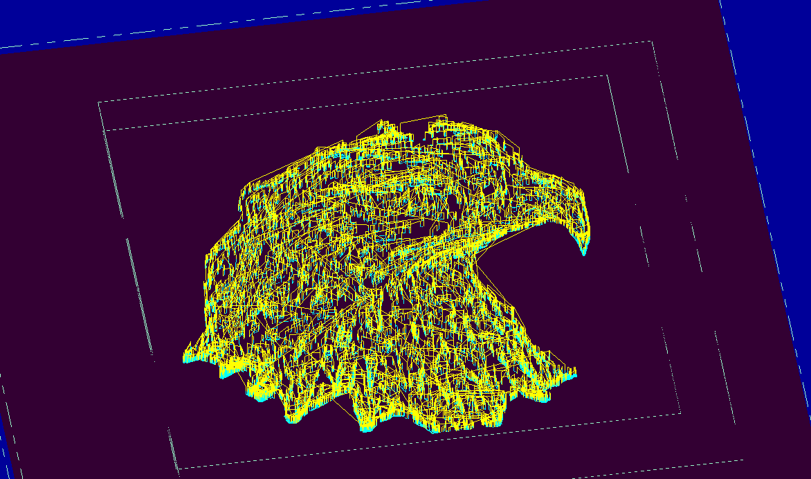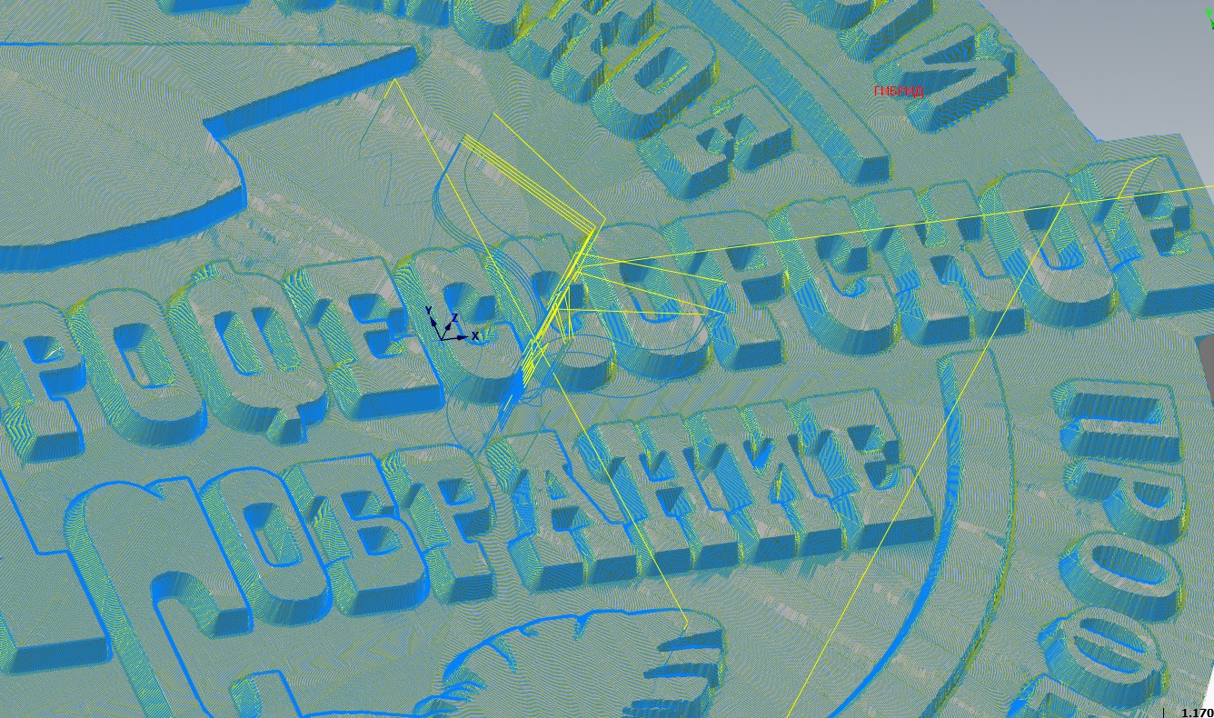 Я перерисовал модель. Сделал уклоны под 45 градусный гравер. Запустил резать по Гибридной траектории... Гравер - 0.1 мм, 2А угол 45 градусов, подача 500 мм/мин, шаг XY 20%... Mach3 по факту режет на скорости от 40 до 110 (feedrate), думается мне, что просто негде с таким рельефом разгоняться ему. Ну либо станок просто не может так быстро команды обрабатывать.