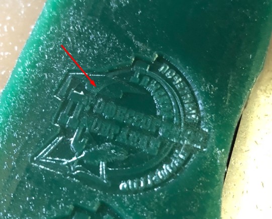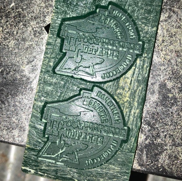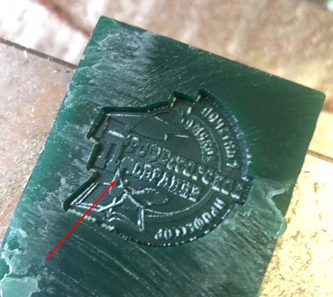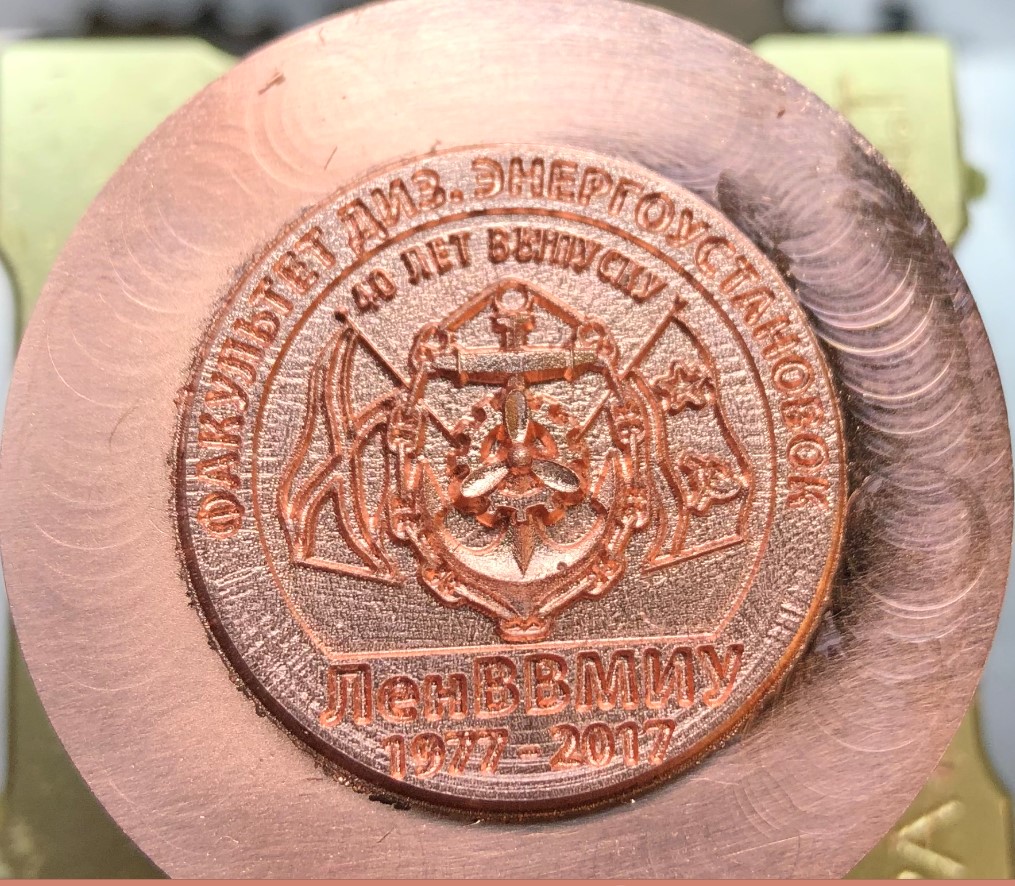 Если приглядеться, вокруг знака - плоскость, обрабатывалась 6 мм прямой фрезой, с шагом по XY - 5% - после нее видны следы. Хотя, там траектория вся по одной и той же Z написана... Откуда эти следы? Совсем не понимаю.