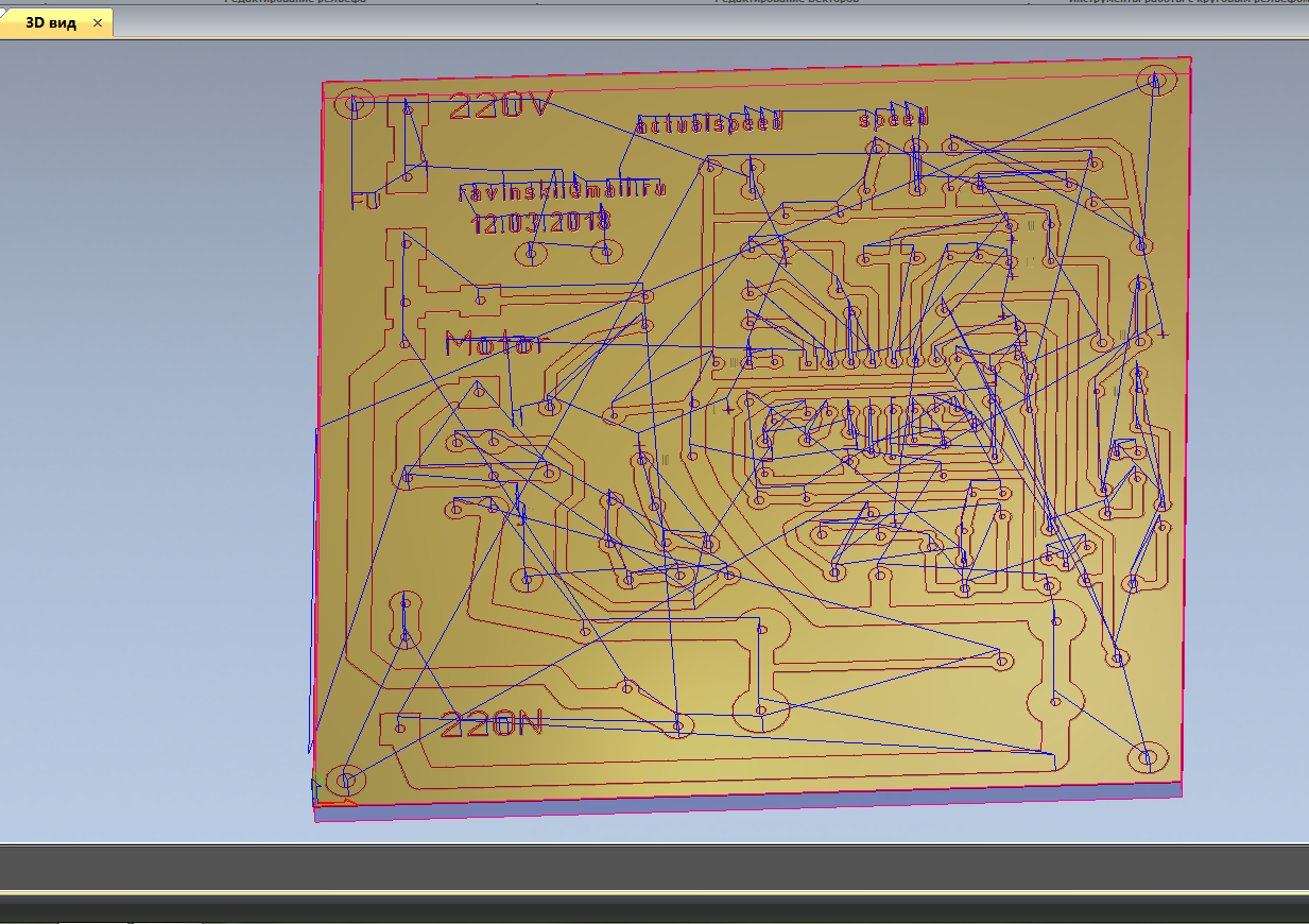 Во , теперь увидел . Спасибо . Действительно так . Поменял , всё встало как надо . Но я всё равно пошёл немного другим путём . Поскольку результат всё равно плохой , это по тому что наверно СпринтЛоут ломанный ( скачал 7 версию уже , КСТАТИ в 7 увеличено поле до 300*300 ) . Так вот , я в СпринтЛоуте правлю плату и конвертирую в BMP формат , потом открываю в Пайннете и обращаю цвета , открываю в Арткаме , в векторной вкладке обращаю растр в вектор , с созданием наружного контура , выделяю всё и в 2D обработке по профилю создаю УП . Гораздо лучше получается . Правда не весь лишний метал убирается - главное прорезать , а там Лут в помощь ( можно перманентным маркером закрасить наконец нужное ) . Надо додумать как лишнюю медь фрезой убрать . Конечный вариант УП ...maxx2000orel писал(а):А вы гляньте на линейку слева на скрине Лайаута. Там же видно что у Вас как ноль взят Верхний левый угол. Вот и получается, что Х у Вас положительный. а У отрицательный. Найдите на экране маркер начальной точки и перетащите куда Вам удобно. .Mark 24.ru писал(а):Сделал скрин ,