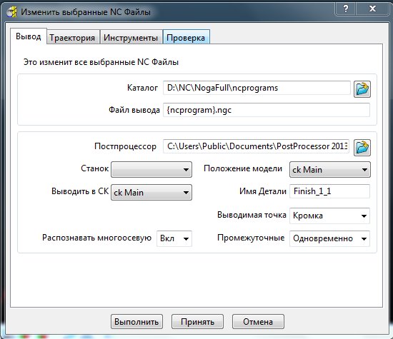 Указать путь к папке с проектом. Вывод файла в нужном формате. И путь к постпроцессору. Указать положение модели. Указать выводить в СК