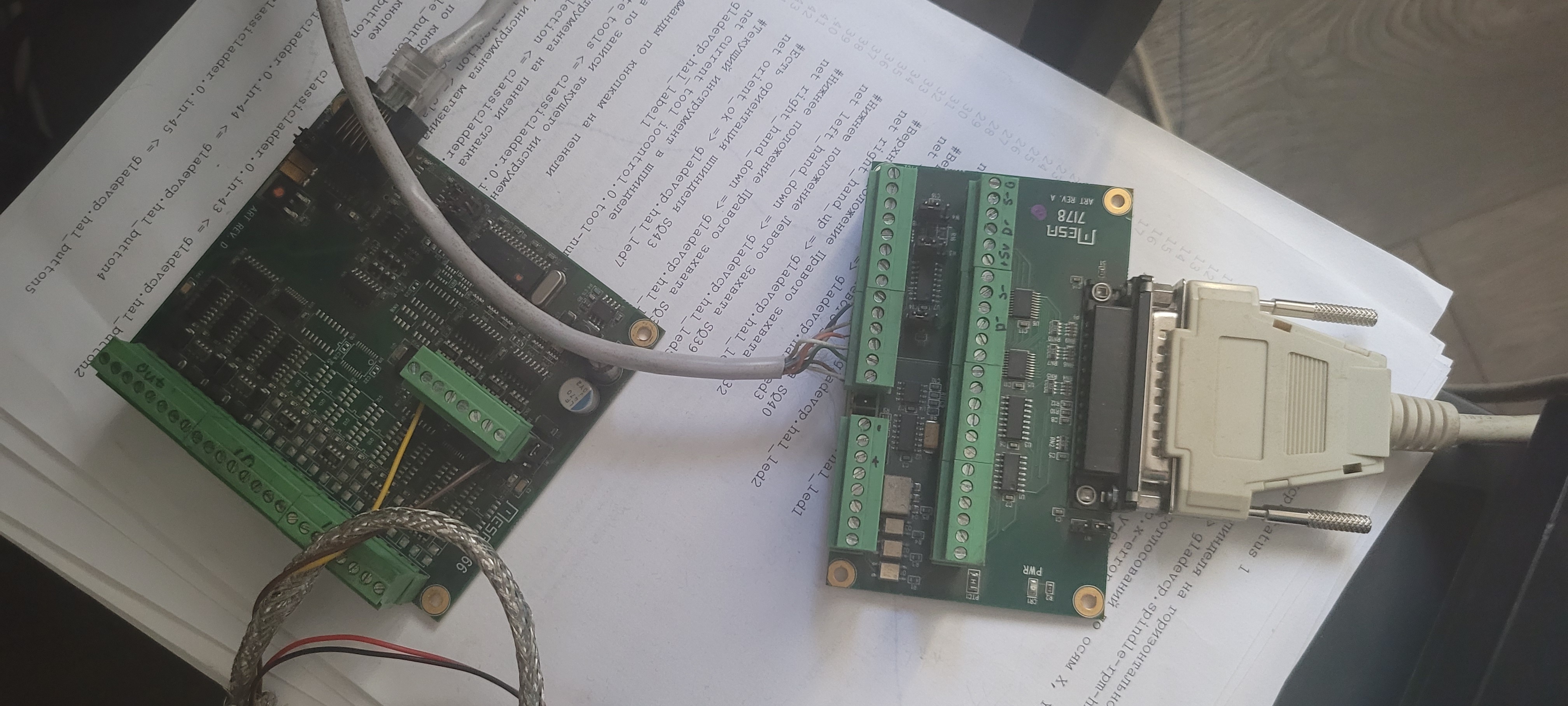 На офф сайта лцнц пока не обращался. Этот комплект плат был под рукой. 7i96s может да, еще подойдет плата для этих целей 7i76 и конфигурируется понятнее. Но их к сожалению нет под рукой. Питание по идет по ЛПТ порту. Сам кабель взял от сборки 5i25+7i77. Сборка работала, так что грешить на него не могу. До этого прозванивал его - все было ок.