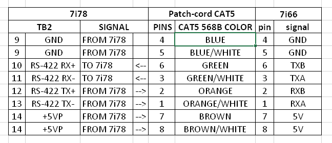 7I78 SIGNAL	DIRECTION	CAT5 PINS	CAT5 568B COLOR