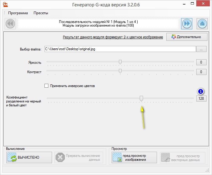 Шаг 2) Нажатием на кнопку "Дополнительно" выбираем пункт "на выходе 2-х цветное", и ползунком "коэффициент разделения черное/белое" подбираем такое положение, что-бы избавиться от артефактов, при правом крайнем положении видно от чего нужно избавиться: