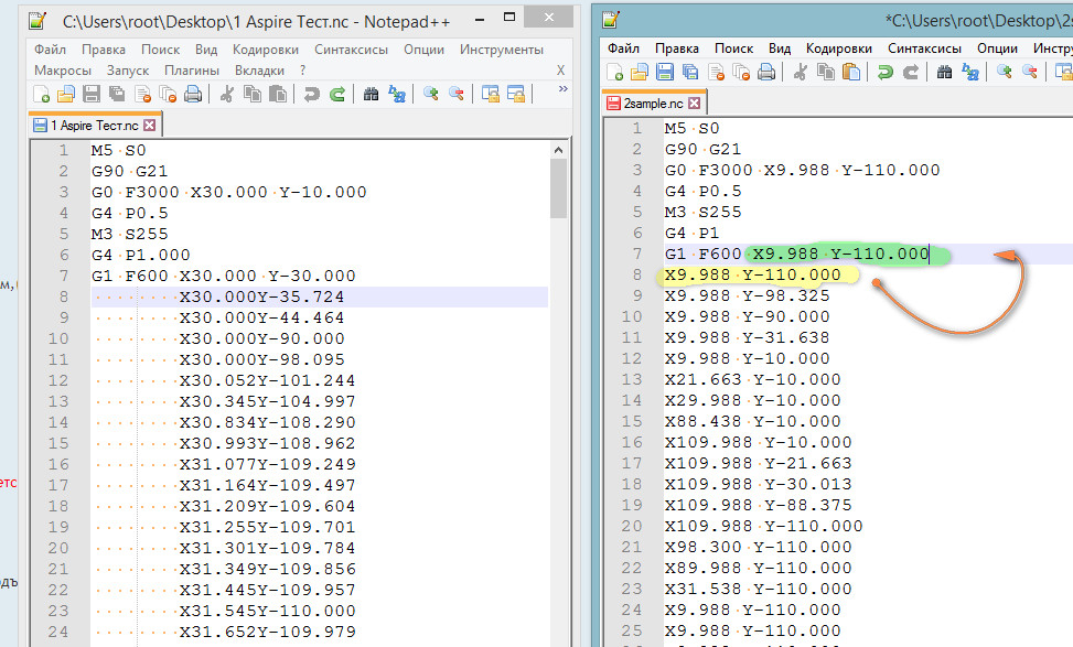 По этой проблеме уточню: В Aspire файл экспортировался через EPS, если через DXF делать, то приходится вектора в Aspire "заменять отрезками прямой", иначе тоже бардак.selenur писал(а):А если первую строку движения №8 перенести к строке №7? заработает? т.к. пока только это бросается в глаза.Q-starь писал(а):Ещё у меня непонятка с началом движения по по всем траекториям,( но это скорее вопрос к автору контроллера):