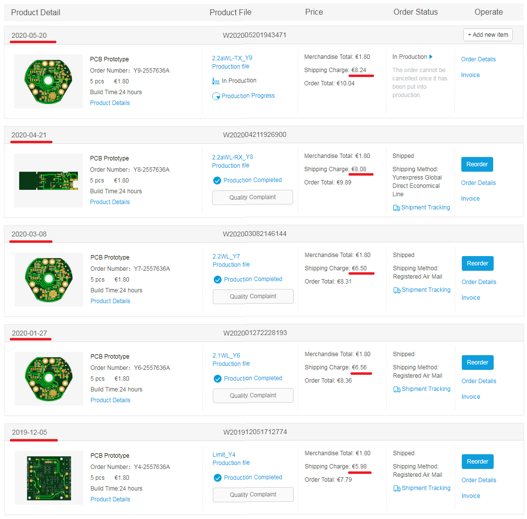 тоже периодически заказываю ответственные платки на JLC-PCB, доставка дорожает и становится медленней с каждым разом...selenur писал(а):в китае на днях изготовление 5-ти плат заказывал размером 100х72 мм, так с доставкой в 700 рублей обошлось