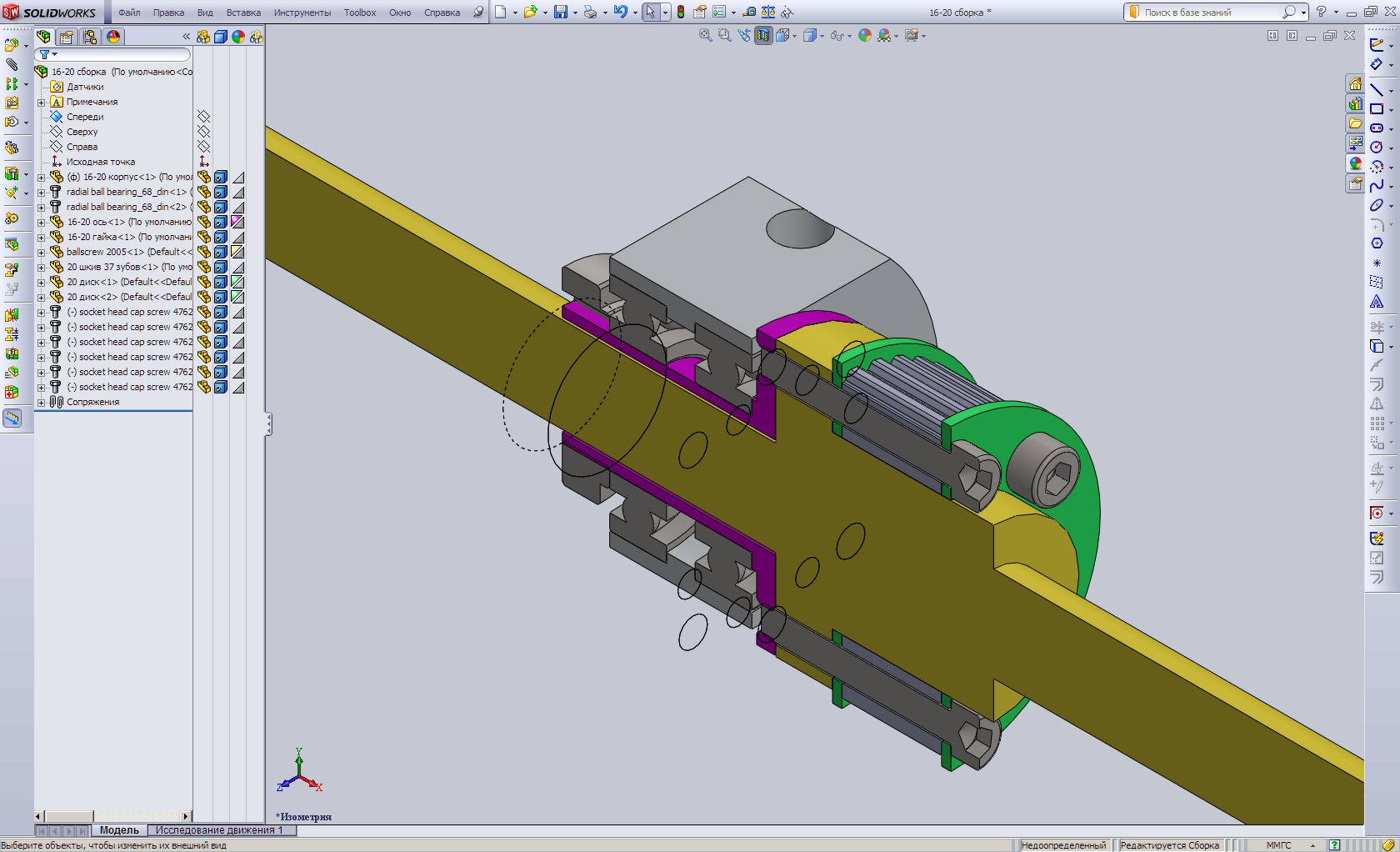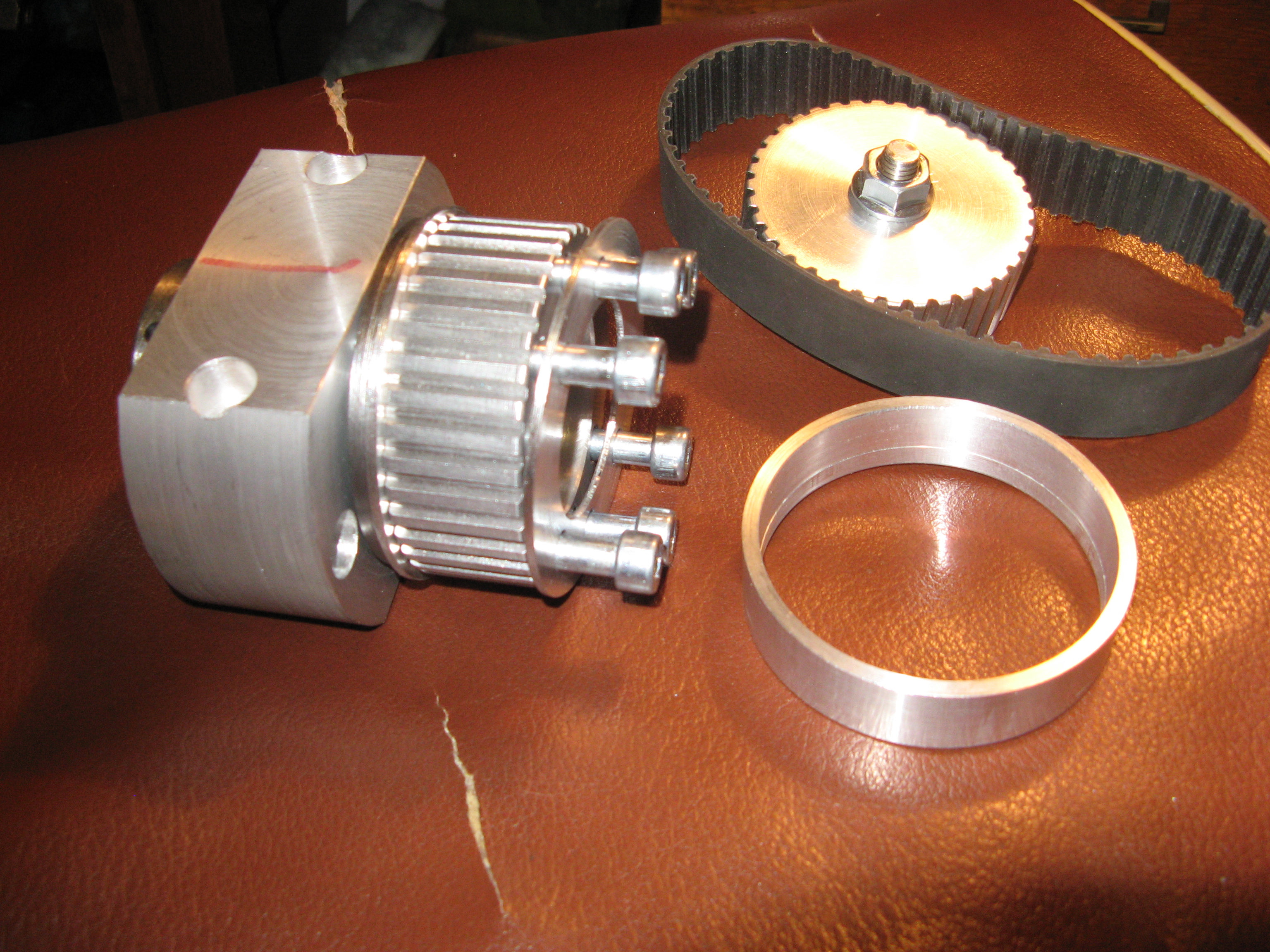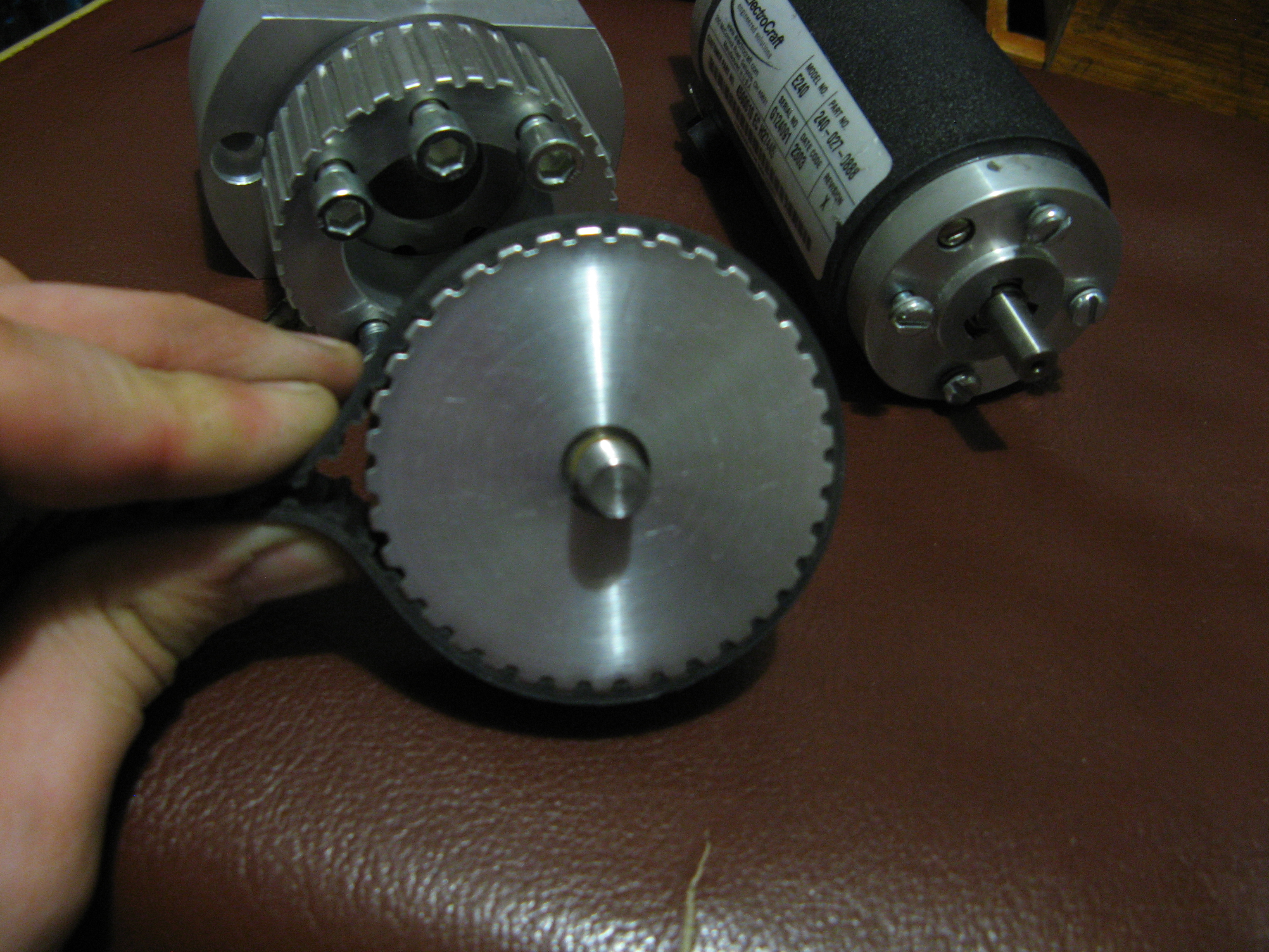 шкив одевается на гайку швп (желтый цвет) и подтягивается болтами к оси (малиновый цвет), которая вращается в корпусе на 2х подшипниках. второй шкив который на мотор ставится не показан, но думаю это итак понятно.кроме того показываю фотки своего недавнего заказа - под 20ю швп. серва типоразмера нема23 просто для примерки