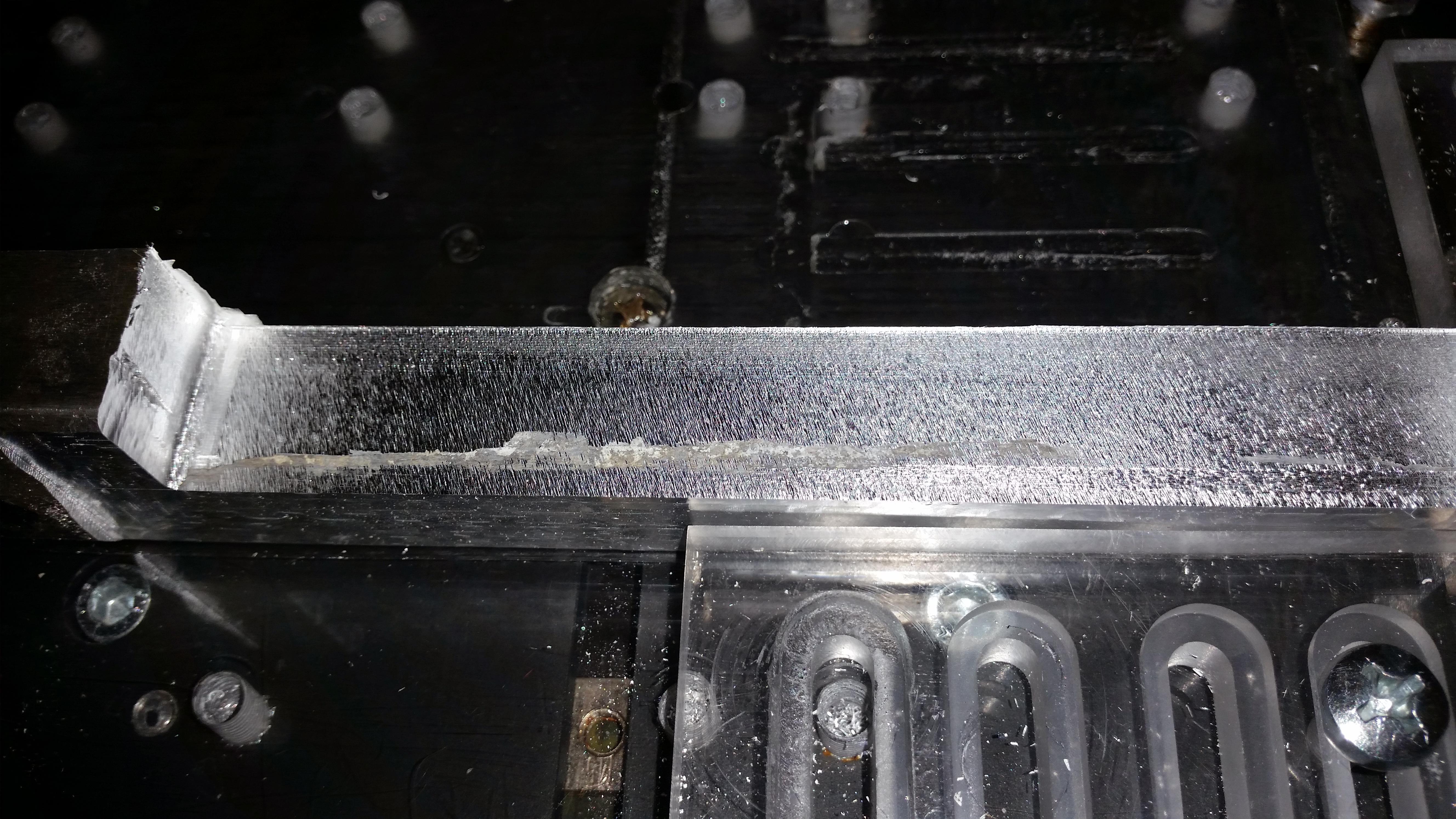 Короче, что ни делай, а отвод тепла и вымывание стружки - мегазадача. Можно дуть сильно. Я пробовал пром пылесосом постоянно стружку выгребать - вроде классно, но как только отошел покурить - кранты. Все плохо. Либо паз "грязный" поскольку его стружкой царапает, либо фрезе уже кранты. Да и, поскольку в офисе, то пылесос этот не вариант - жужжит очень громко. Громче станка. Меня сразу выселять начинают.