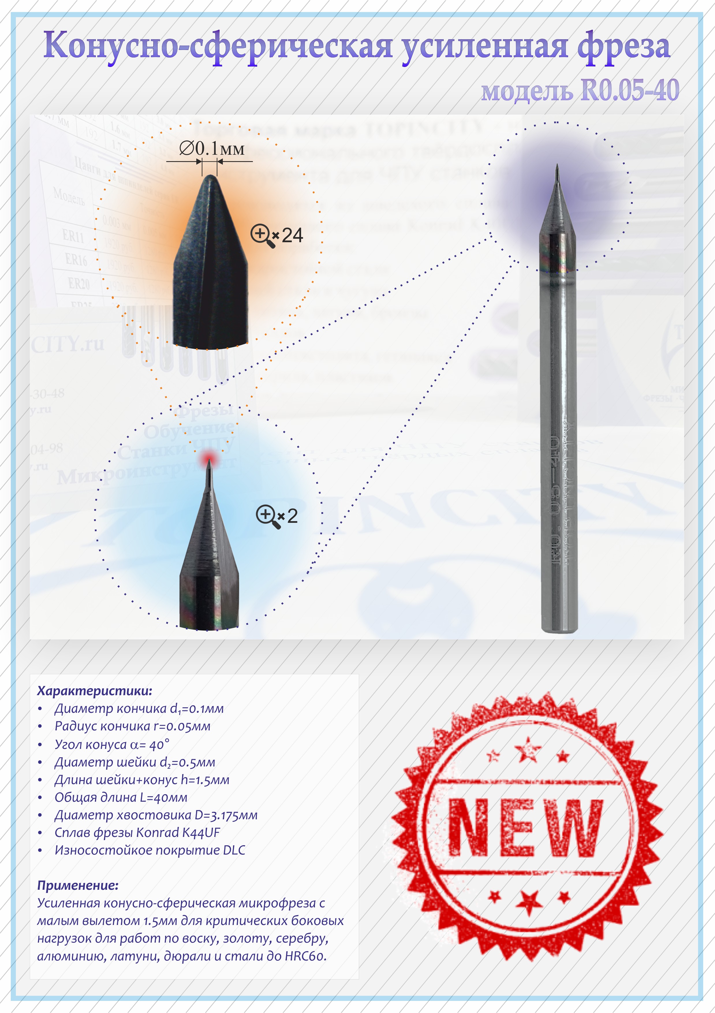 Посмотреть на сайте актуальную информацию о наличии и цены: https://www.topincity.ru/frezy/flg-shurup.html* Диаметр кончика d=0.1мм