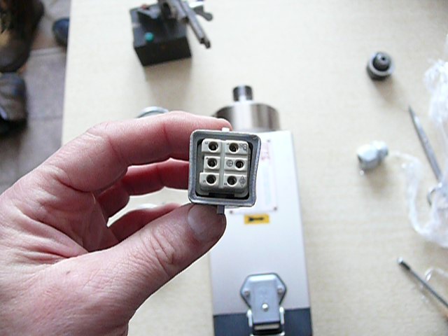 Жаль, что не умею выкладывать видео, а то бы я продемонстрировал все ваши косяки, поскольку вскрытие коробки со шпинделем я заснял на видео. На нем видны и замятины на резьбе, и вмятины на подшипниковом модуле и на шильдике. Могу выложить только фото замятого с двух сторон штеккера (колодки?) для подключения. В тиски зажимал что - ли?