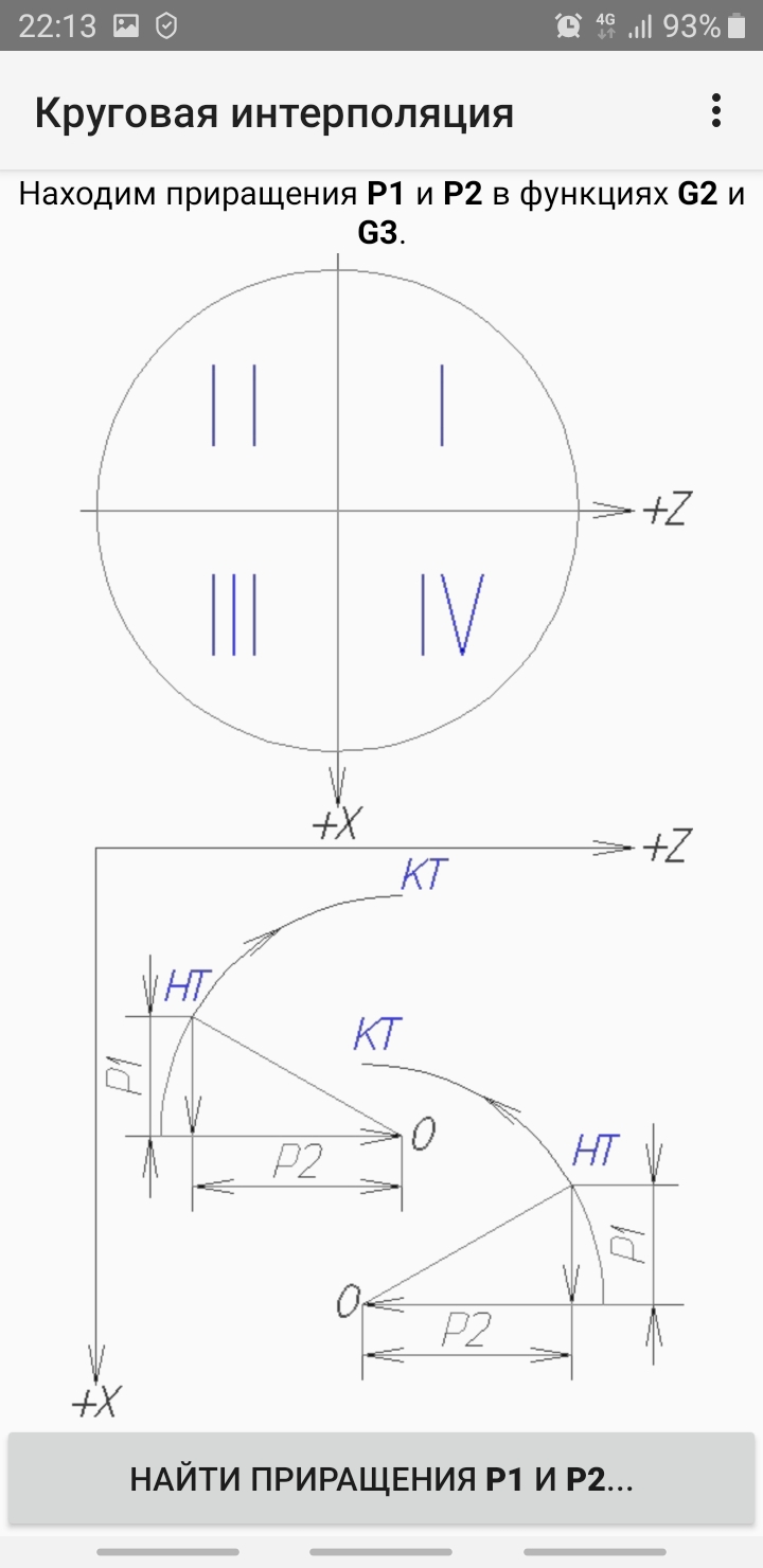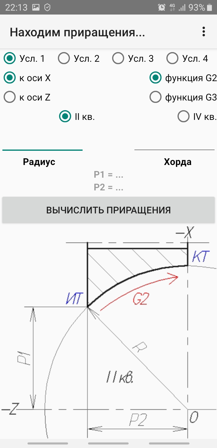 Краткое описание: Программа, работает под управлением о. с. Android ver. 4.3 и выше. Предназначена для узкого круга специалистов, а именно операторов, наладчиков, программистов и токарей, работающих на токарных станках под управлением стойки УЧПУ Электроника НЦ 31-02, а так же её модификации на базе модуля программного управления НЦ-31. Основная задача программы это нахождение приращений Р1 и Р2 в функциях G2 и G3 круговой интерполяции, при точении радиусов с углом меньше 90°.