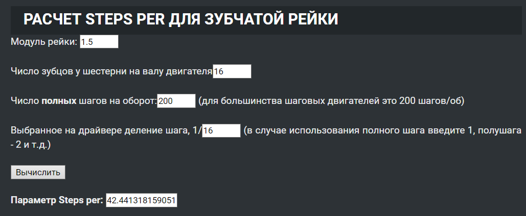 Шаг зуба рейки с модулем 1,5 = 4,7124 мм. Умножаем на 16 зубов = 75.3984 мм. Столько проедет станок за один оборот шестерёнки. Умножаем на редукцию 0,25 (1:4) = 18.8496 мм. Столько проедет станок за один оборот на входе в редуктор=вал двигателя. Чтобы двигатель сделал один оборот нужно 200*4=800 шагов. Итого 800 шагов и 18,8496 мм. 800/18,8496=42.4412 шага на мм. Правильно! :o Но как!?))