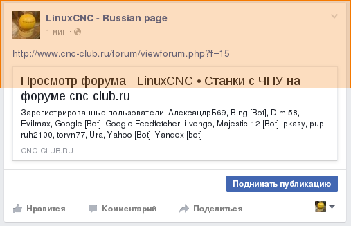 Попробовал сделать сообщение о разделе форума по LinuxCNC в Facebok,