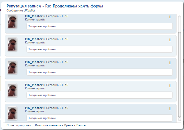 Проверял сегодня скрипт репутации форума с помощью тестового аккаунта. В итоге нашёл небольшой недочёт, который позволяет ставить по несколько оценок за раз. По две, по три, даже по шесть за раз. Имея десяток одноразовых ящиков, можно с них не спеша зарегаться, и в лёгкую набить в любой аккаунт желаемое кол-во плюсов. Можно дойти до 400 и потом лепить людям минусы. Недочёт на серверной стороне. Хоть я и веб-мастер, но сразу на ум не приходит как это пофиксить. С кем бы поговорить на этот предмет?