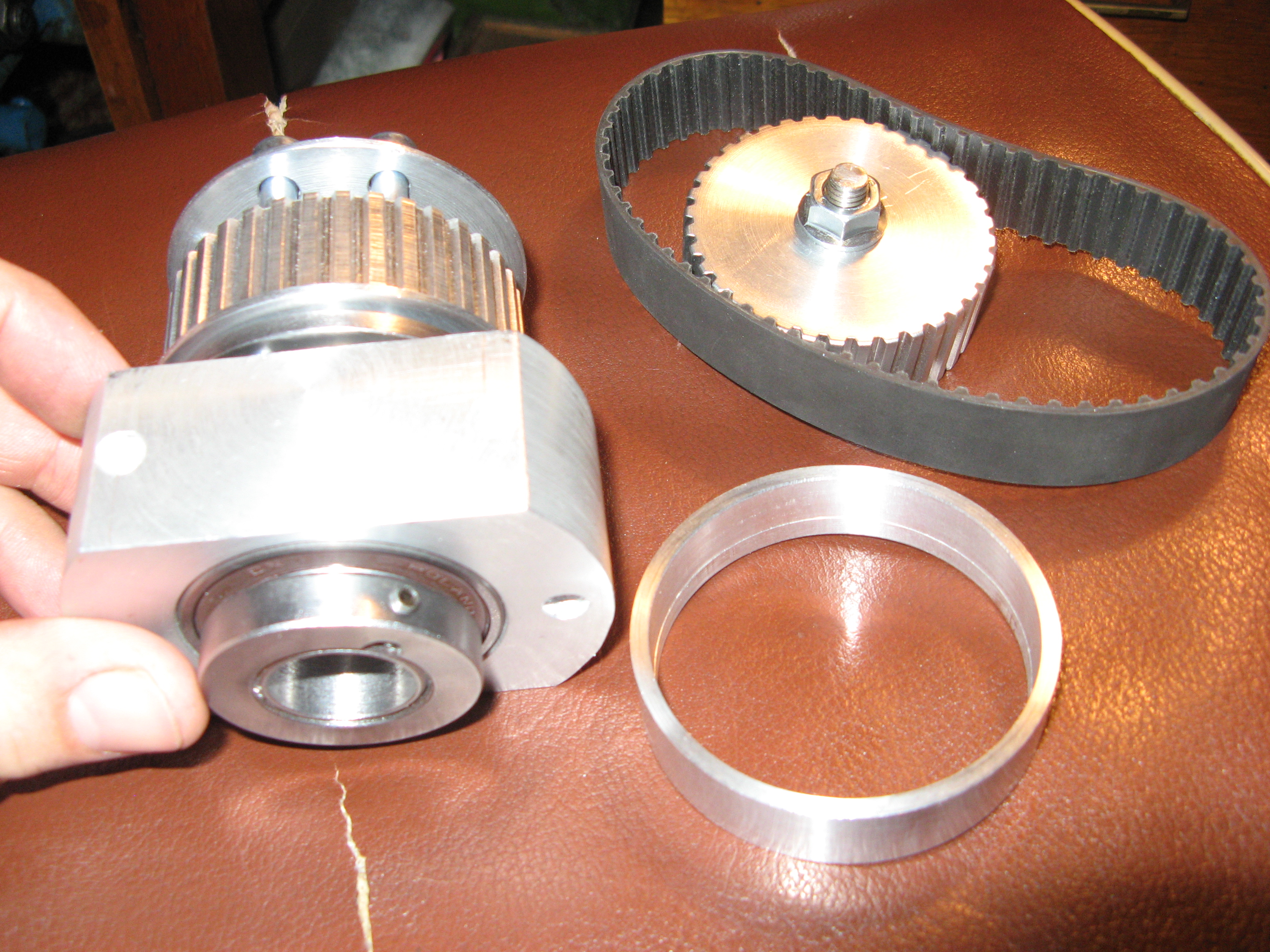 шкив одевается на гайку швп (желтый цвет) и подтягивается болтами к оси (малиновый цвет), которая вращается в корпусе на 2х подшипниках. второй шкив который на мотор ставится не показан, но думаю это итак понятно.кроме того показываю фотки своего недавнего заказа - под 20ю швп. серва типоразмера нема23 просто для примерки