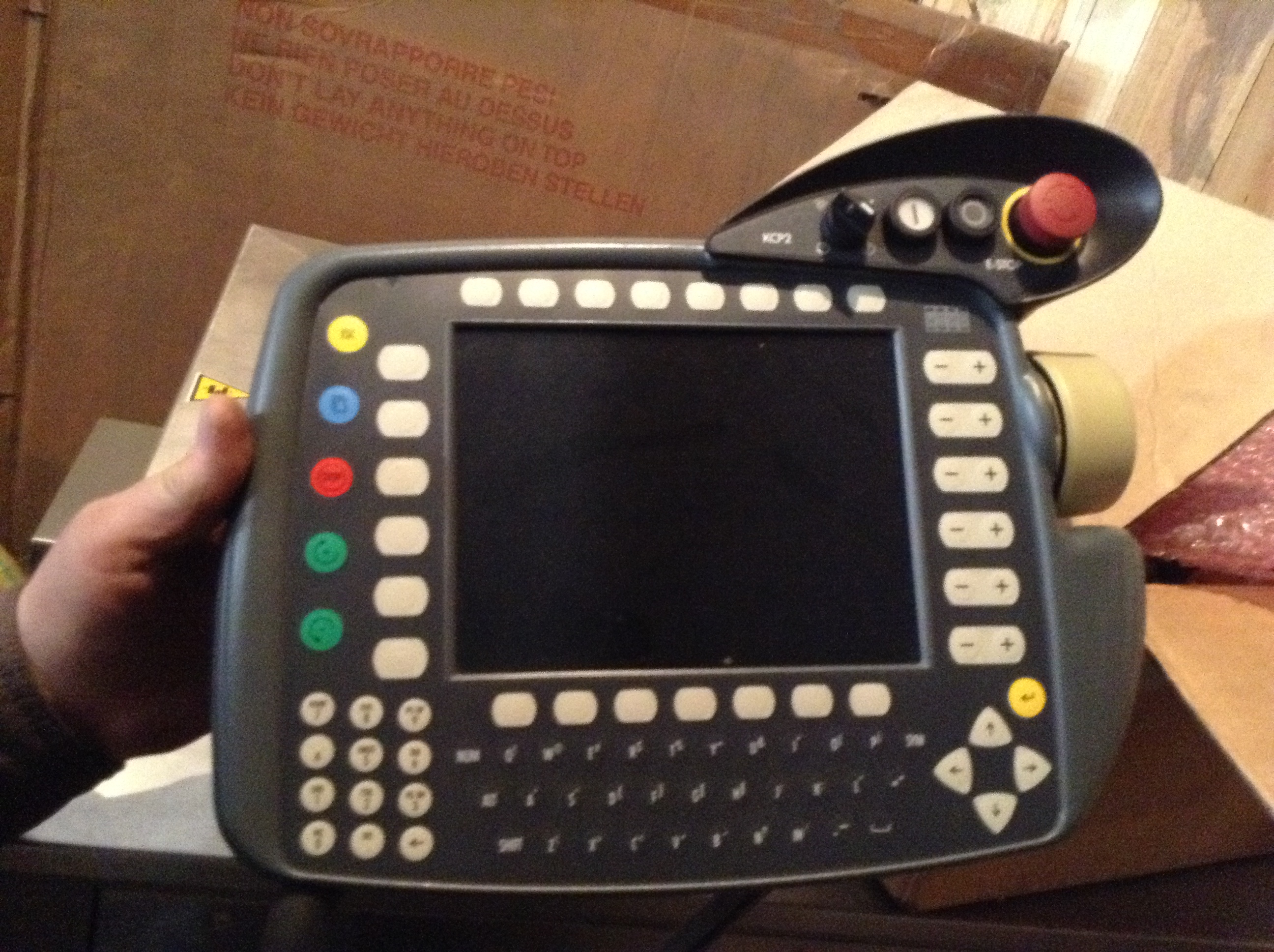 робот полностью комплектный..шкаф управления (к сожалению по времени изготовления робота уже предыдущей серии чем сейчас выпускают)..переносной сенсорный пульт управления...и есть станина которую использовали для установки на выставках...