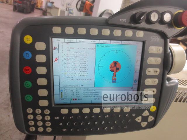 6 axis industrial robot, Kuka KR15/2 on a 7 axis model KL 250/2 linear track, with nominal hubs running from 3 to 5 meters. Equipped with the KRC2 controller which adds a 7 servocontrolled axis for the linear unit. This accesory makes the KR15 a suitable unit for machine tending and welding of large parts.
