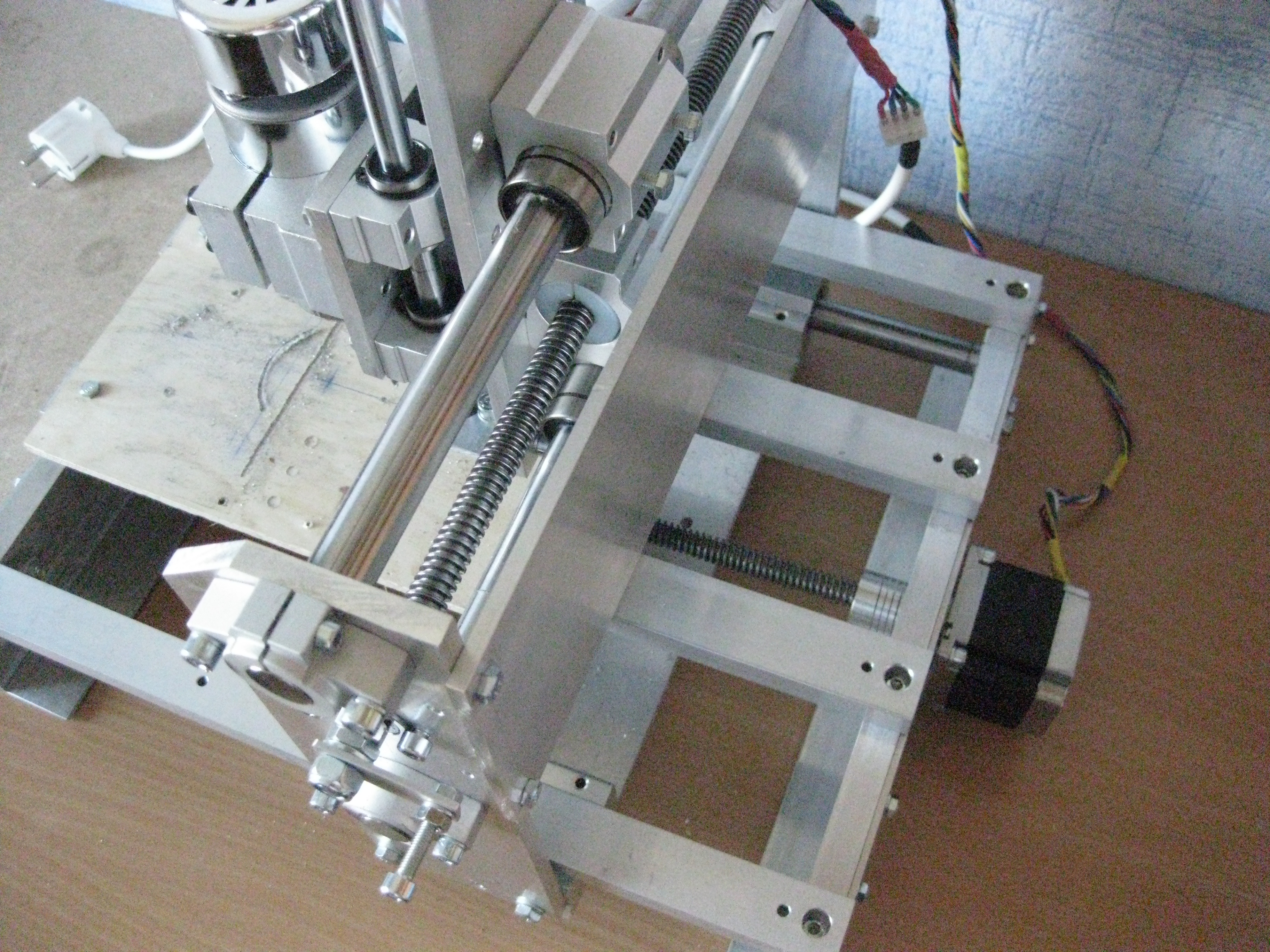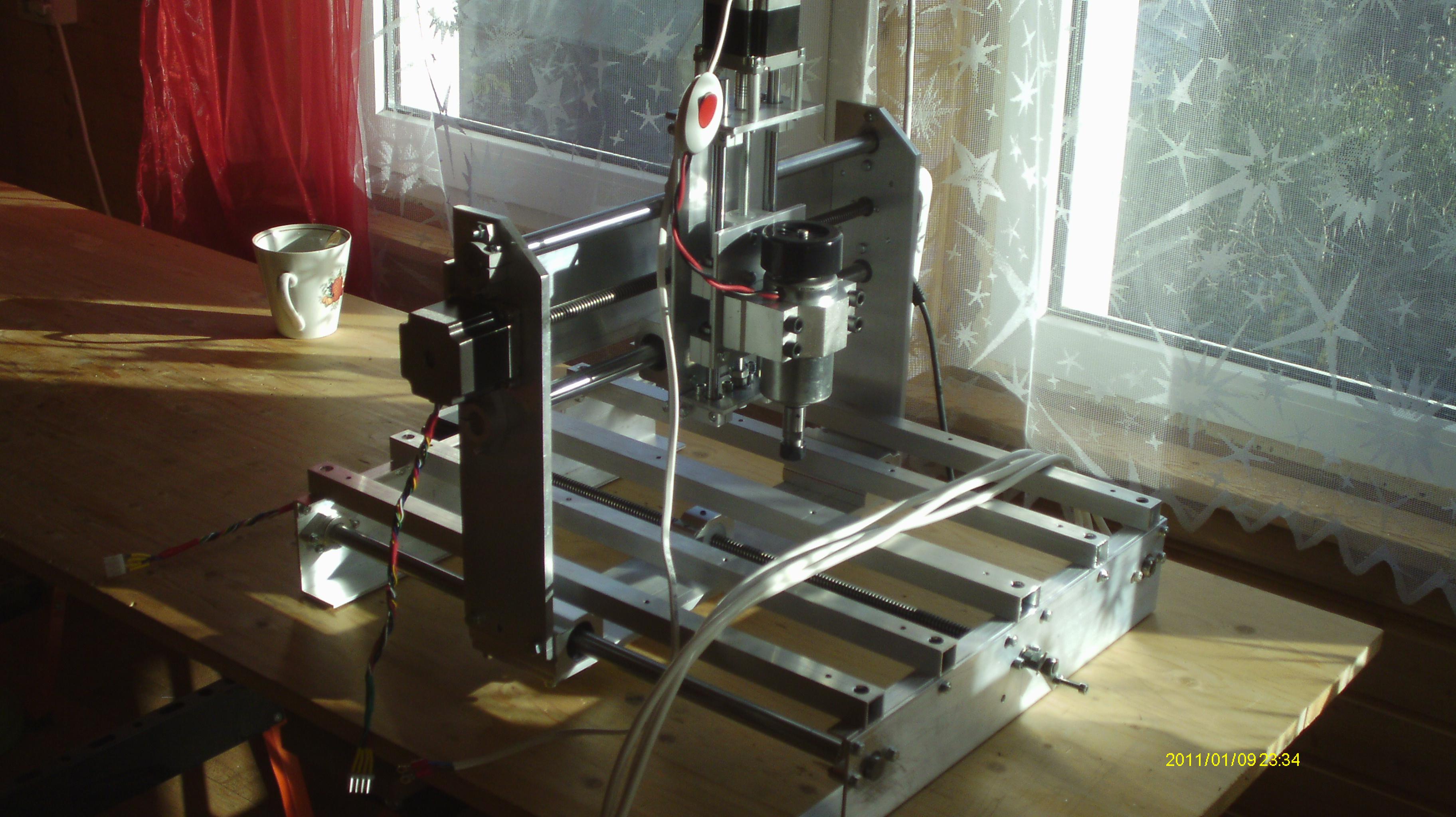 Собран из алюминиевого профиля, общие внешние габариты станины 340х400, высота 450мм, рабочее поле 270х210х100мм (ориент.), вес около 12кг. Установлены шаговые двигатели НЕМА-23 с крутящим моментом около 11кгс. Шпиндель 12-48вольт (пост), мощность 400вт, обороты до 12000об. в минуту с цанговым зажимом под фрезы с «хвостовиком» 3,175мм, малошумный.