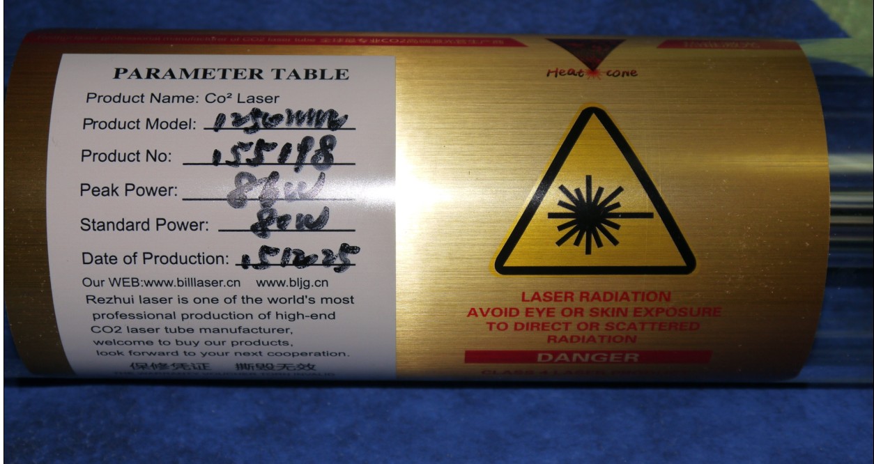 80 ватт "BillLaser". 1250 длинна 80 диаметр, по результатам измерений пиковая мощность 86 ватт, сайт производителя http://www.billlaser.cn// и http://en.bljg.cn/ . 24 тысячи.