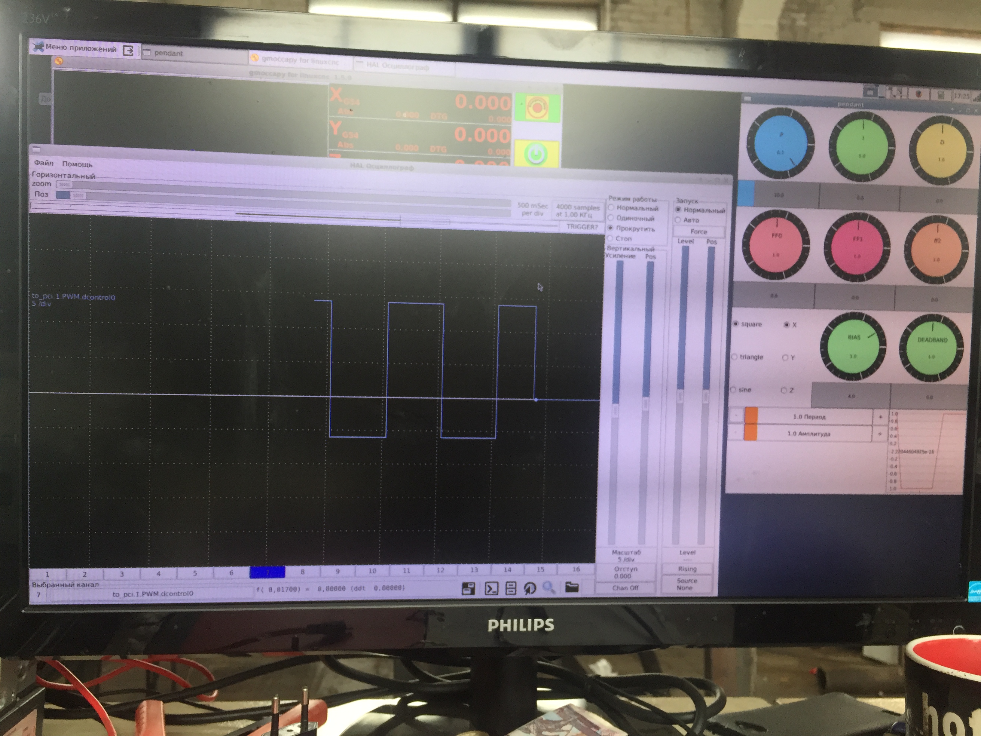- Программой гонял приводы по оси на 50мм и глядя на осцилоскоп настраивал ПИ петлю на усилке.