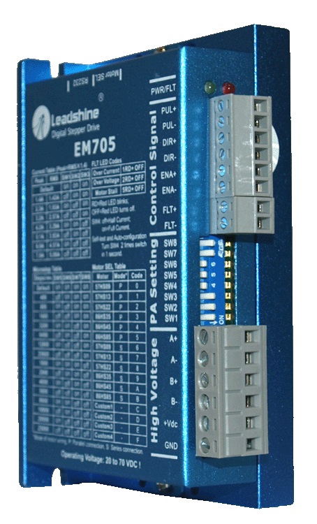 Высокопроизводительный цифровой драйвер Leadshine для 2-х фазных шаговых двигателей. Использует команды "Шаг и направление" или управление CW/CCW. Имеет функцию обнаружения потери скорости, самодиагностику и технологию автоконфигурации. Количество микрошагов от 1 до 512. Напряжение питания до 70В постоянного тока. Выходной ток программируемый, от 0,5А до 0,7А.