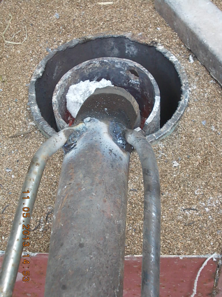 Модернизировали печку для плавки. Плавится теперь на газу + искричестве (оно же электричество). Тигель сделали отрезав 600мм баллона кислородного. Тигель получился примерно на 20л