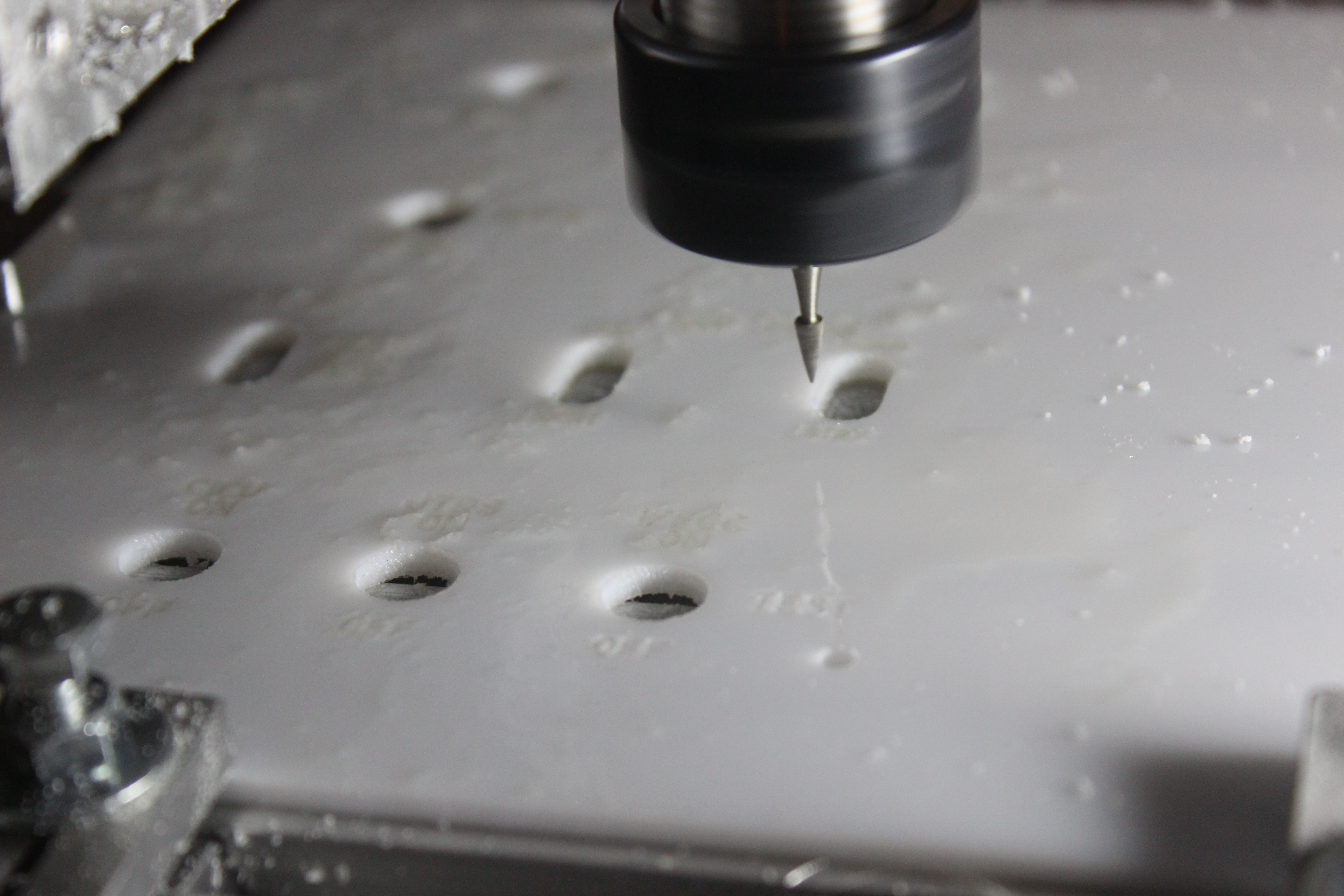 Я какие только обороты и подачи не подбирал, но стоит отойти от станка, пластик налипает на гравёр и портит всю работу. Спасает только водичка с капелькой моющего из шприца в зону обработки. Заодно и при гравировке мелких деталей мелкая стружка не разлетается, а "кучкуется" в капле воды.
