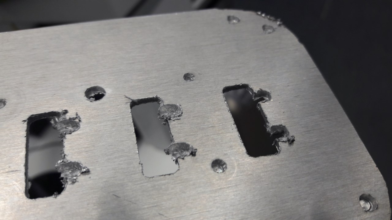 Материал до этого был 5052 и он оставлял рваные наплывы и моментально забивал фрезу, взяли 6061 и с ним уже начало резать , но как видно на фото далеко от идеала..