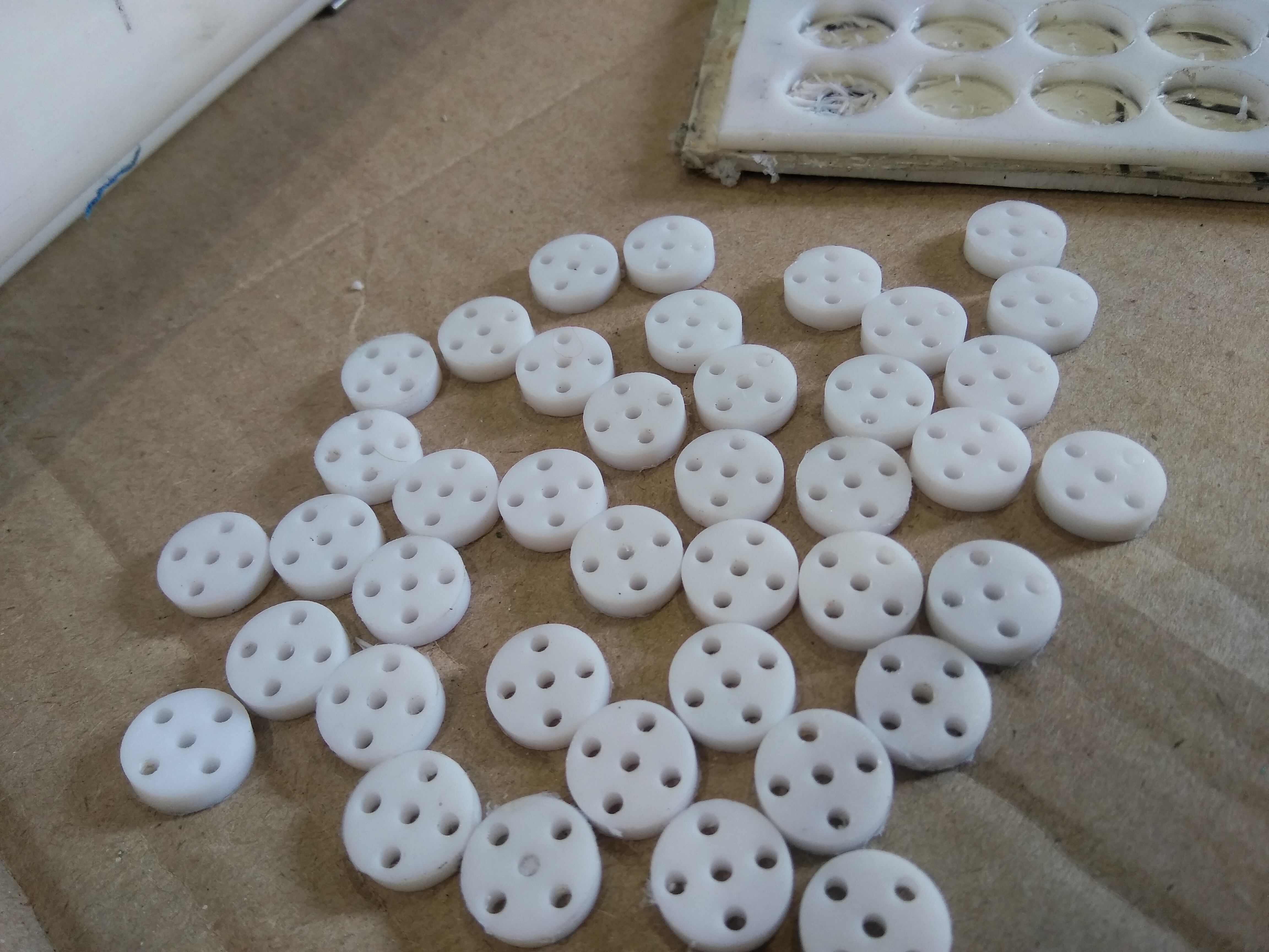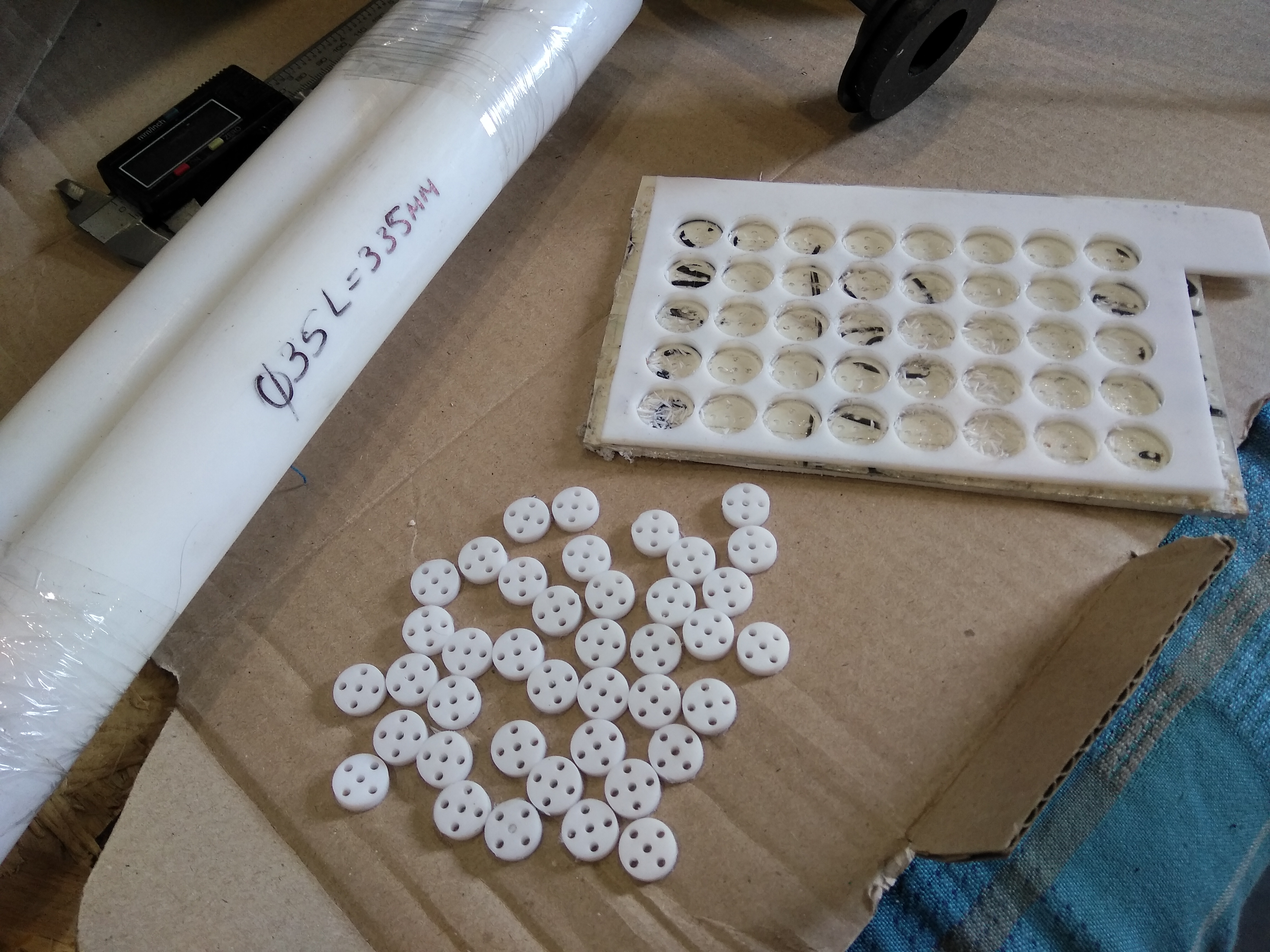 В общем получилось. Диаметр деталей всего 12мм. Нашелся в гараже двухсторонний скотч, который неплохо клеился к фторопласту. Но это и дало некоторые проблемы - клеевая основа скотча налипала на фрезу. Подача была 0.06 на зуб, обороты около 4000. За первый проход 2.5мм, за второй уже насквозь. На некоторых деталях остались заусенцы, которые легко снимаются канцелярским ножом. На 40 деталей ушло порядка 25 минут (реально можно было минут 5 сэкономить, сделал маленькую подачу на сверлении). 4 детали оторвало, пара из них покоцались об фрезу и надо переделать. Направление фрезерования встречное, размеры ушли в минус. Пока все вписываются в диапазон 11.95-12мм (допуск до ±0.1мм). Теперь предстоит вырезать 120 деталей, уже около 30мм в диаметре. Так что скотч реально помогает, даже на мелочевке.