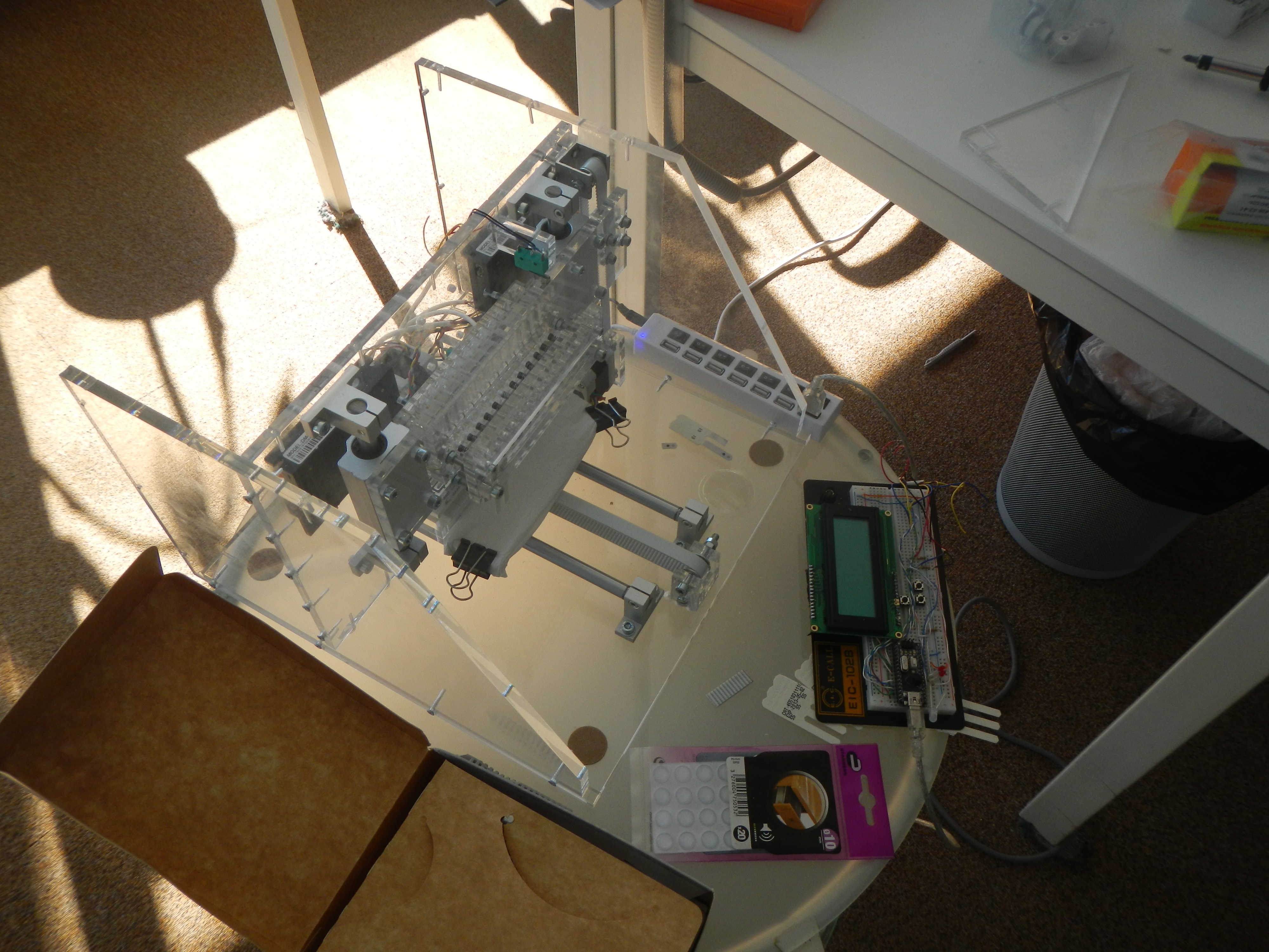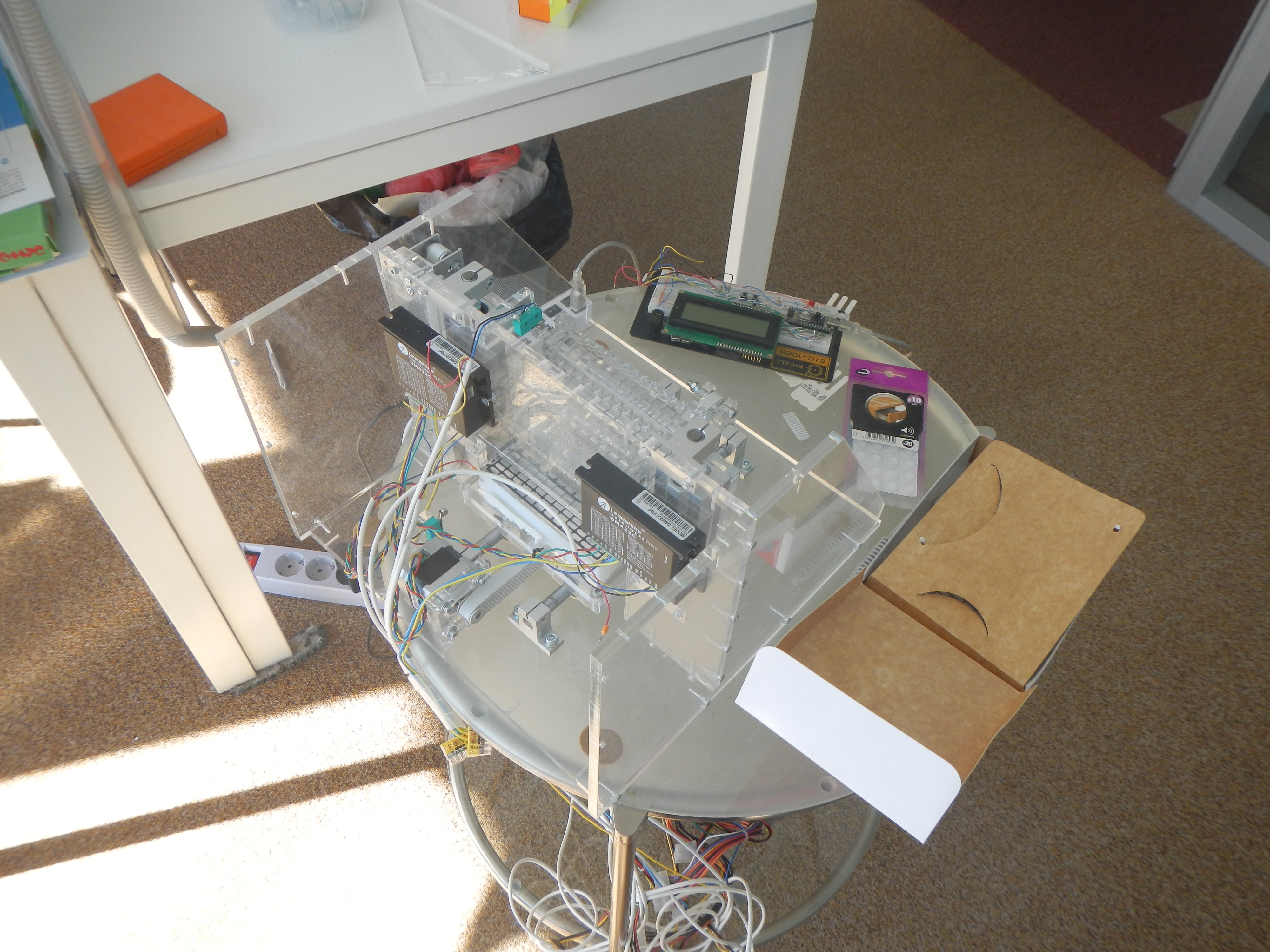 Управляется все это дело от ардуинки - два степпера, два датчика + панель оператора с lcd, тремя кнопками.