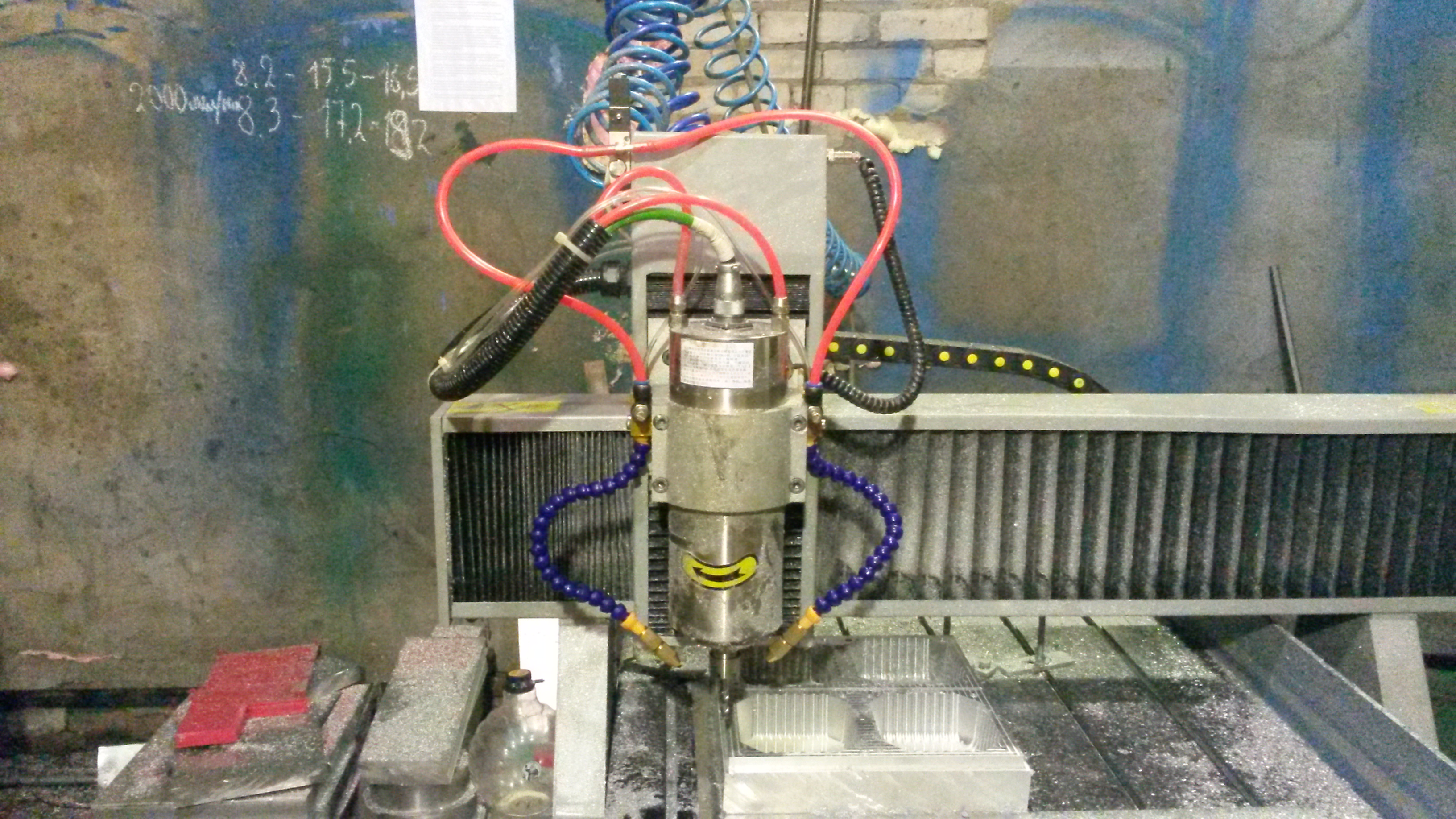 Было несколько сбоев в процессе работы в которых виновато было не подключенное заземление инвертора и шпинделя плюс очень большая зависимость контроллера станка от нестабильности напряжения сети.А вот жесткости партала не хватает для алюминия -буду усиливать потом .