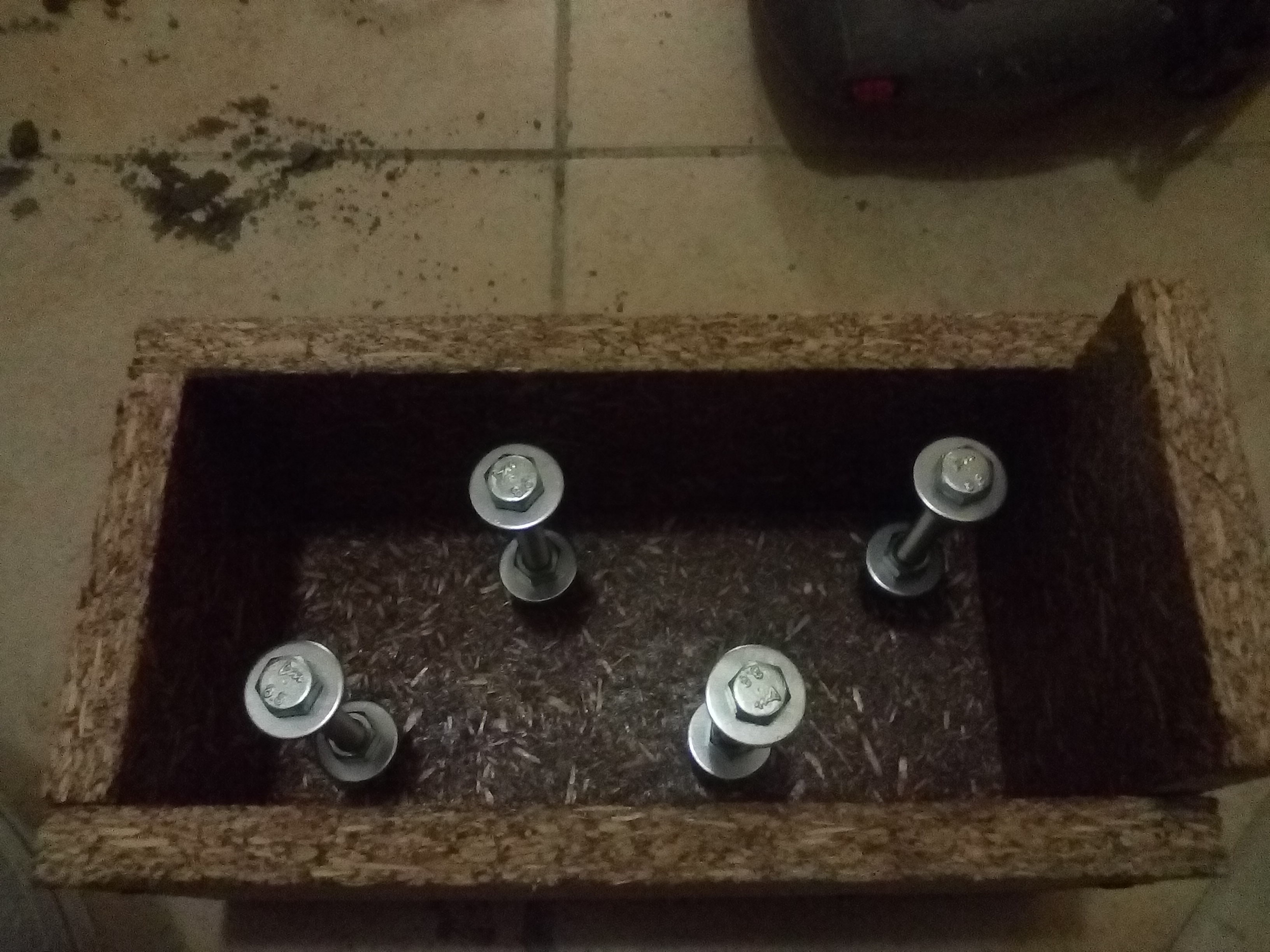 Собрал каркас из доски 100*50, на него прикрутил лист ДСП. Сделал борта высотой 100 мм, стянул их шпилькой М8, на дно поставил закладные для возможной установки в будущем плиты на нормальные сварные стойки. Закладных сделал пять штук, дабы можно было выбирать - на 3 точки ставить или на 4. Конструкцию закладных взял ту же, что показывал на рисунке выше, только из гайки М12.