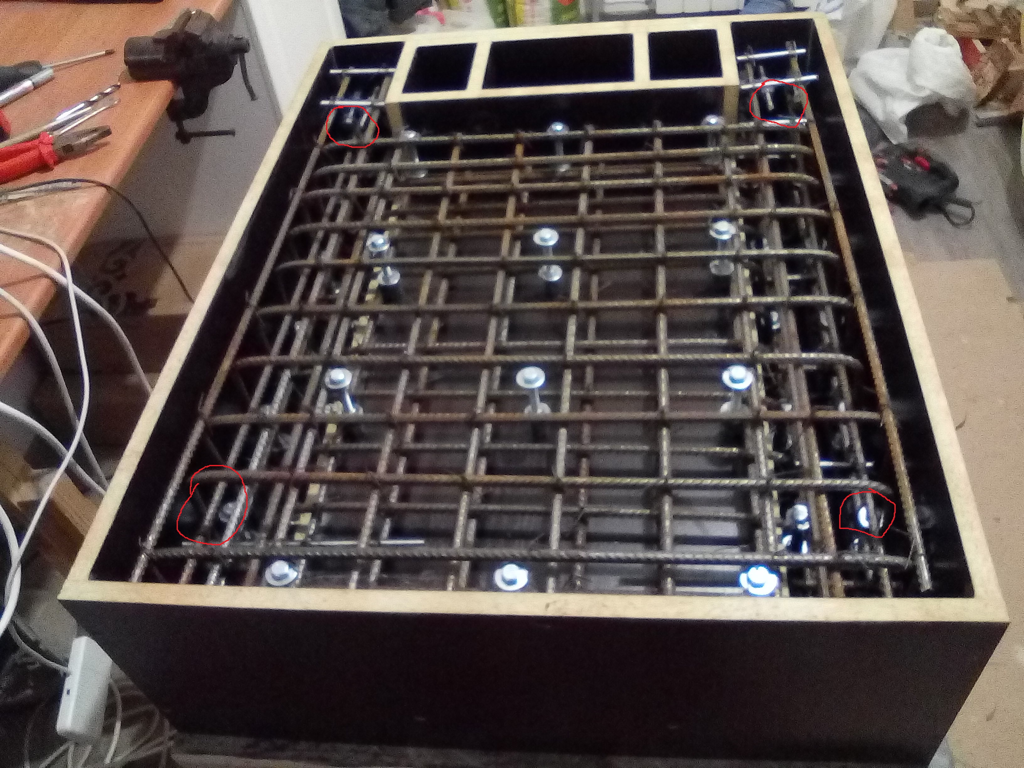 В принципе, осталось кинуть пару шпилек поперечных и можно заливать... Но что-то никак не могу решить вопрос с закладными под будущие опоры станины. Предположим, соберу я стол-каркас из профильной трубы. Насколько необходимо прикручивать к нему станок? Возможна ли просто установка станка на каркас, на несколько точек?